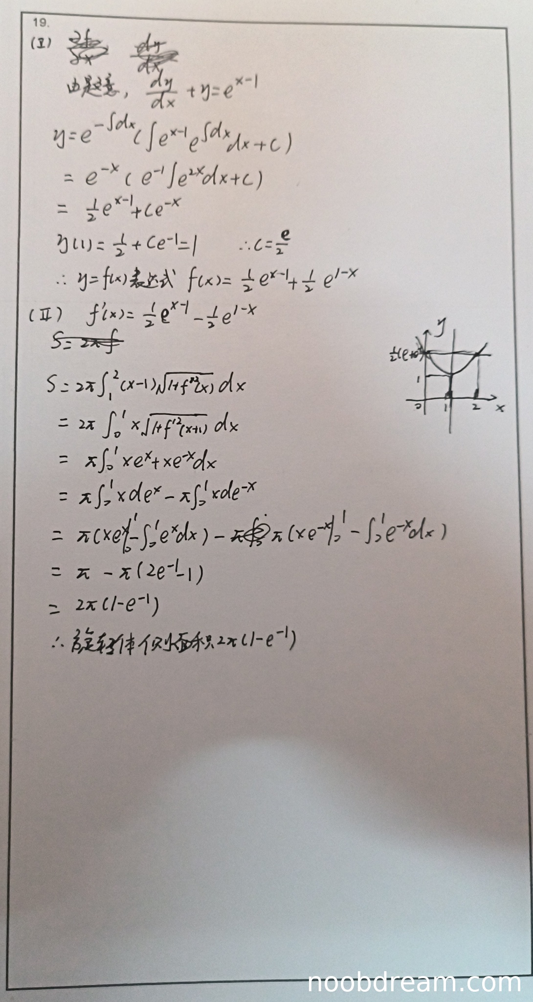 学生正确写出旋转体侧面积公式 \( S = 2\pi \int_{1}^{2} (x-1)\sqrt{1+f'^2(x)}dx \),并进行了变量代换 \( x \to x+1 \) 将积分区间变为 [0,1]。在计算 \( \sqrt{1+f'^2(x)} \) 时,学生直接得到 \( \sqrt{1+f'^2(x+1)} = \frac{1}{2}(e^x + e^{-x}) \),这与标准答案通过复杂推导得到的结果一致。后续积分计算正确,最终得到正确答案 \( 2\pi(1-e^{-1}) \)。虽然推导过程与标准答案不同,但思路正确且结果正确。得6分。