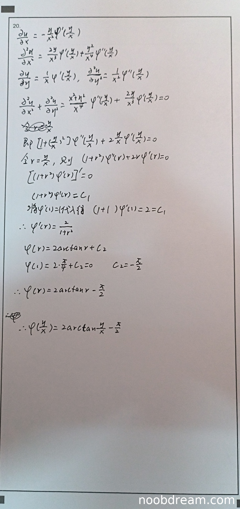 - 正确代入拉普拉斯方程并化简:得到方程 \((1 + r^2)\varphi''(r) + 2r\varphi'(r) = 0\),与标准答案一致。