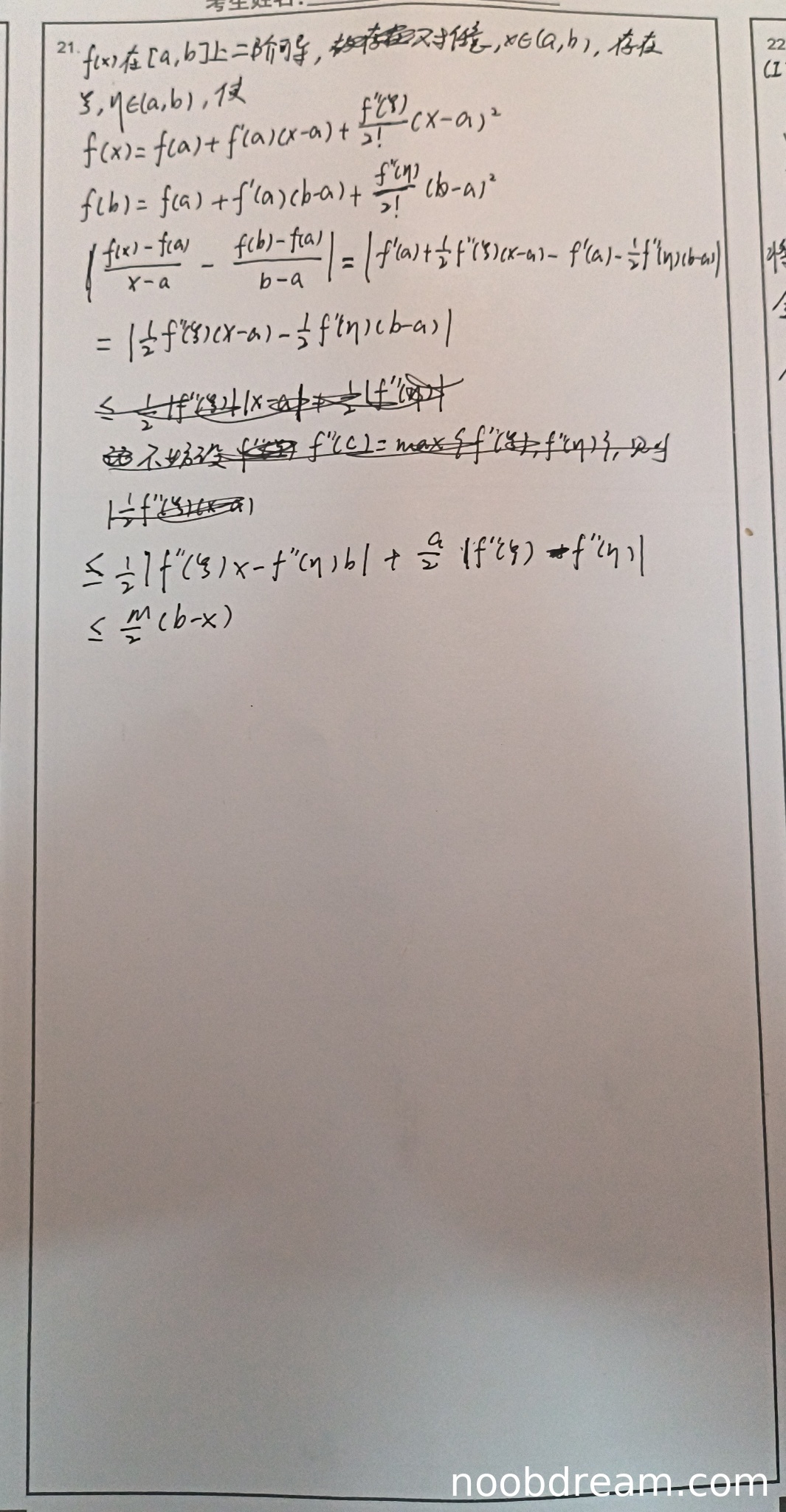 - 在展开式中使用了$f'(a)$,但题目条件只保证$f(x)$在$[a,b]$上二阶可导,并未说明$f'(a)$存在(实际上二阶可导隐含一阶导数存在,但这里展开形式可能不够精确)