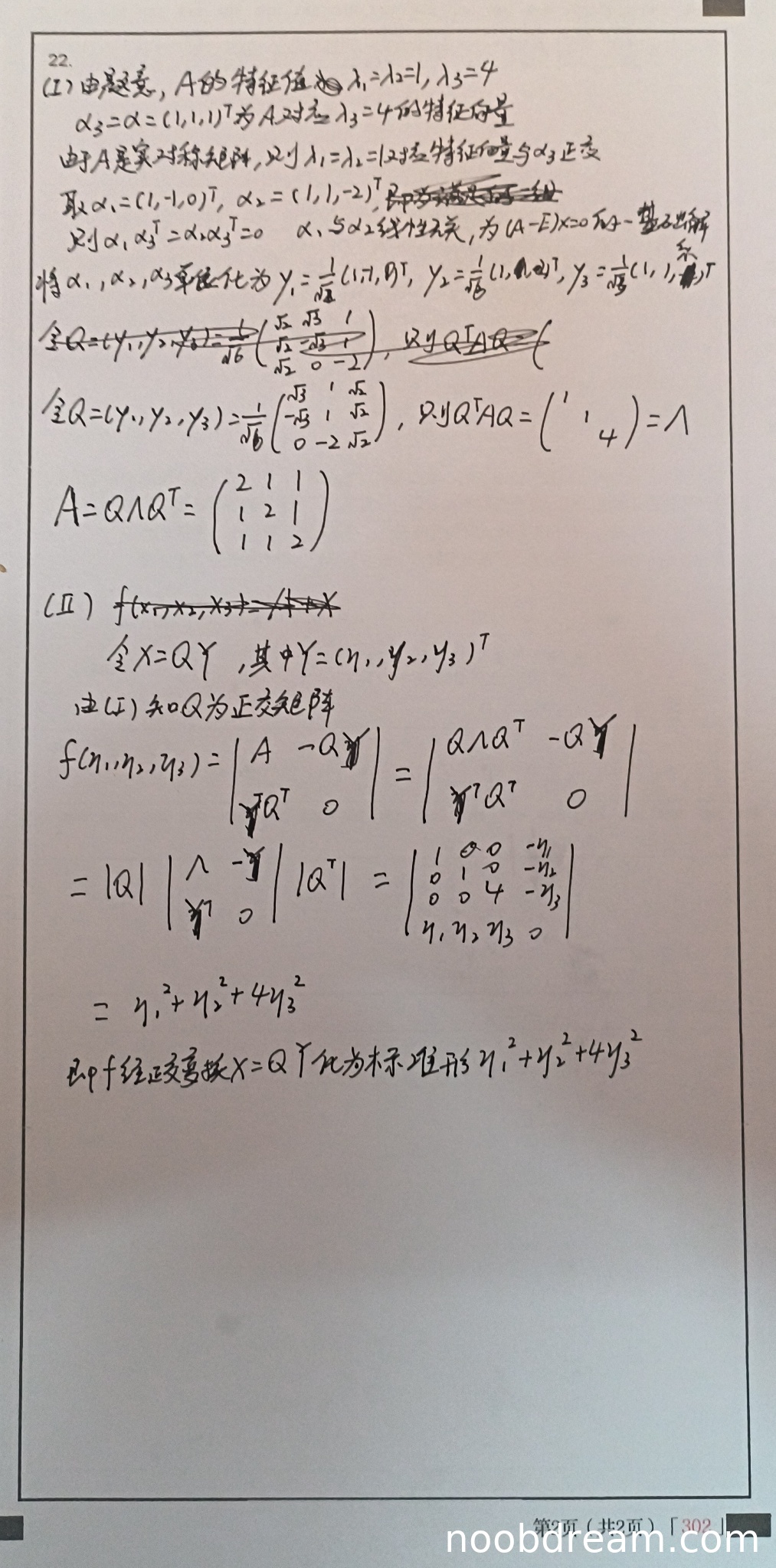 学生正确识别了特征值(λ₁=λ₂=1,λ₃=4)和特征向量α₃=(1,1,1)ᵀ。选取了与α₃正交的特征向量α₁=(1,-1,0)ᵀ和α₂=(1,1,-2)ᵀ,并进行了单位化。虽然学生给出的正交矩阵Q的具体形式与标准答案略有不同(例如γ₂和γ₃的分母和元素顺序),但最终计算出的矩阵A = [[2,1,1],[1,2,1],[1,1,2]]与标准答案一致。这表明核心逻辑和计算是正确的。考虑到可能存在识别误差(如矩阵元素符号、分母等细节),这些不影响最终结果,因此不扣分。得6分。