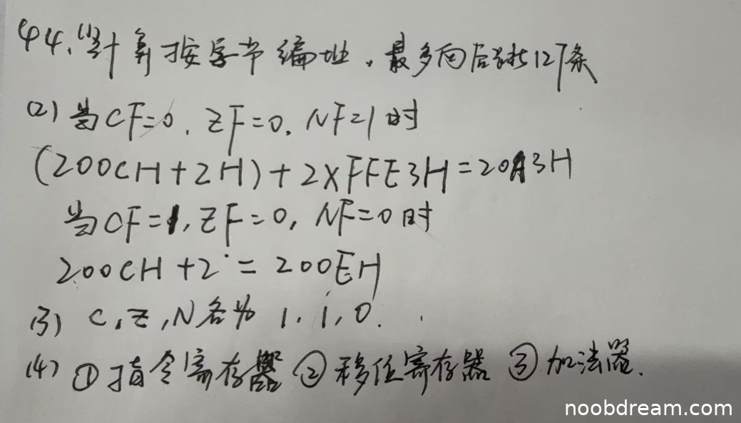 学生正确识别了检测条件(C=0,Z=1,N=1),需要检测ZF和NF。当CF=0,ZF=0,NF=1时,需要转移;当CF=1,ZF=0,NF=0时,不需要转移。对于不转移的情况,PC=200CH+2=200EH,计算正确,得1分。对于转移的情况,学生给出的计算过程为(200CH+2H)+2×FFE3H=20A3H,但标准答案为1FD4H,说明计算错误。偏移量E3H符号扩展后应为FFE3H,左移一位后为FFC6H,200CH+2+FFC6H=1FD4H,而学生得到20A3H,存在计算错误。因此,转移情况的计算部分扣2分。本小题得3分。