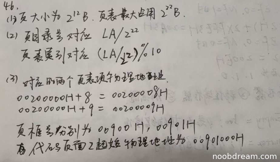 - 页表索引表达式有误:学生写的是(LA/2¹²)%10,但%10表示模10,而正确应为模2¹⁰(即0x3FF)。这里存在逻辑错误,扣1分。