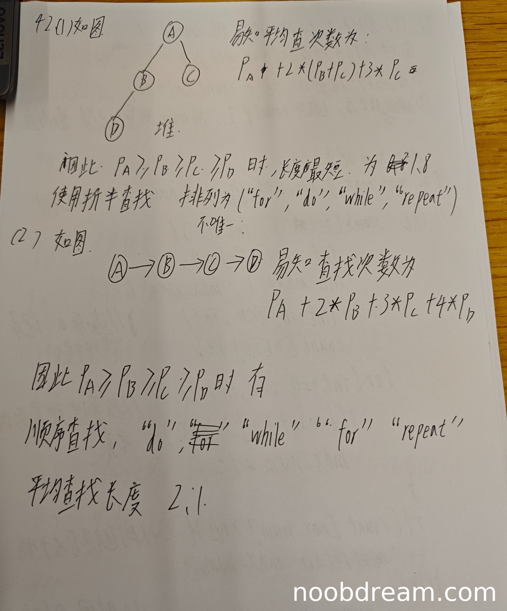 学生回答中提出了按概率降序排列(P_A≥P_B≥P_C≥P_D)的思路,并正确选择了顺序查找方法,得3分。平均查找长度计算正确为2.1,得2分。最终得分为:3(排列和查找方法正确)+ 2(计算正确)= 5分。