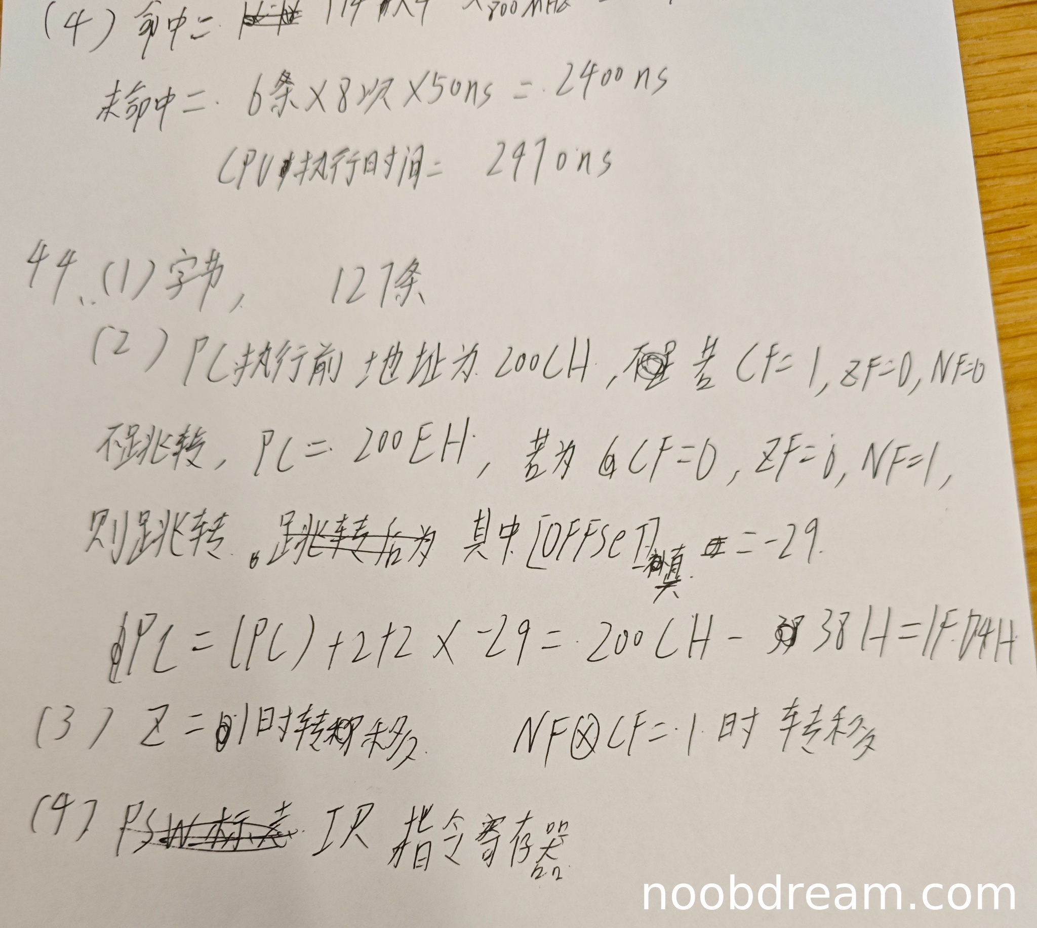 学生正确分析了两种情况:当CF=1, ZF=0, NF=0时不转移,PC=200EH(1分);当CF=0, ZF=0, NF=1时转移,并正确计算偏移量OFFSET=-29(即E3H补码),通过PC=200CH+2+2×(-29)=1FD4H得出结果(2分)。计算过程完整正确。得5分。
