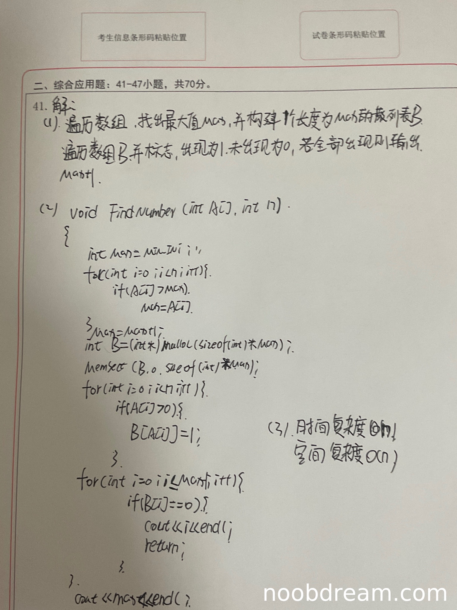 2. 辅助数组B从下标0开始使用,但最小正整数应从1开始检查,代码中直接输出i,当i=0时会输出0,而0不是正整数,这是一个逻辑错误,扣1分