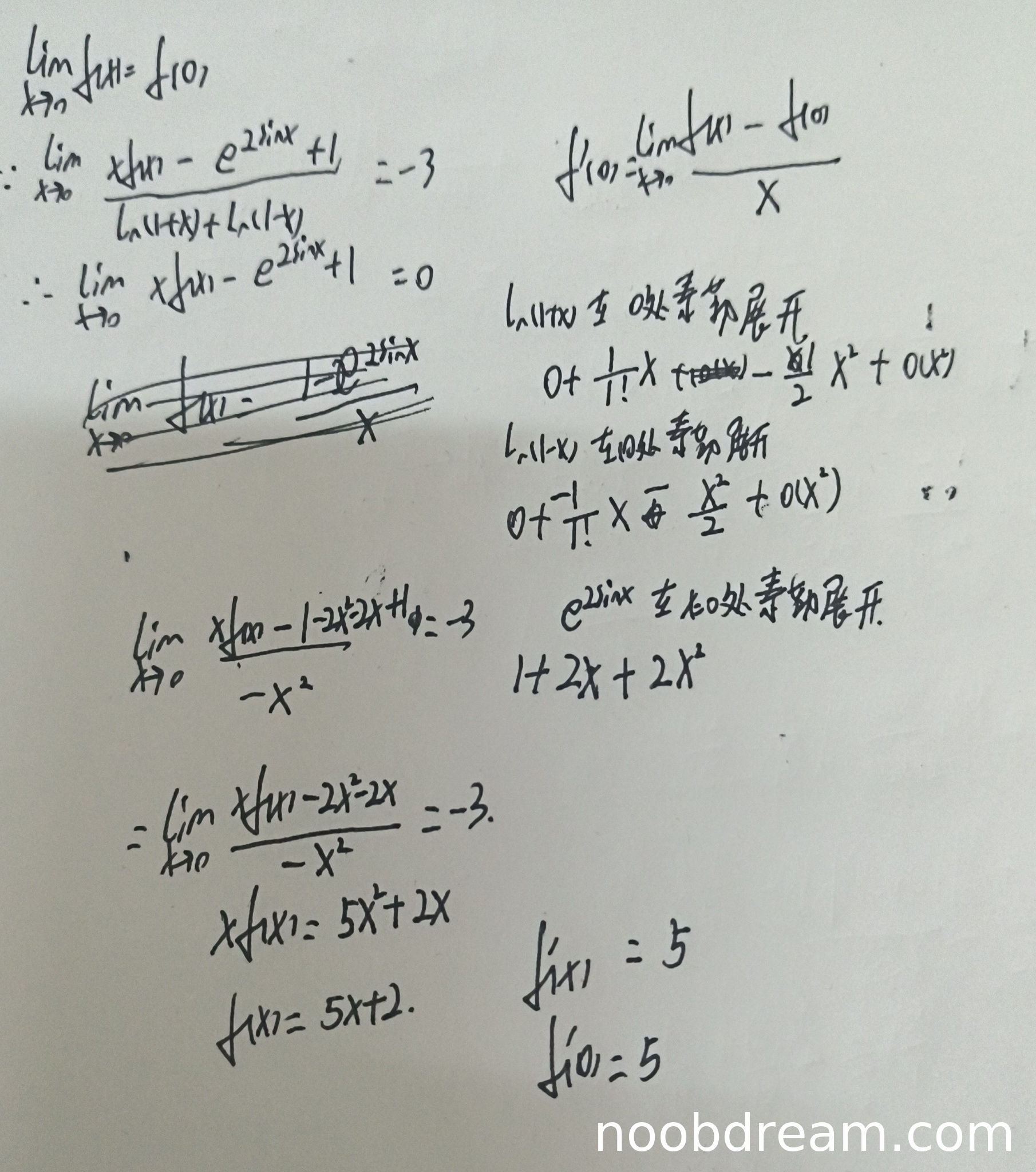 学生正确使用了泰勒展开计算分母和分子,并利用极限条件推导出f(x)的表达式。虽然过程中有部分步骤表述不够严谨(如直接假设xf(x)为二次多项式),但整体思路正确,且最终得到f(x)=5x+2和f'(0)=5的结论正确。扣1分是因为在推导过程中存在逻辑跳跃(如未严格证明f(0)=2就直接使用)。得5分。