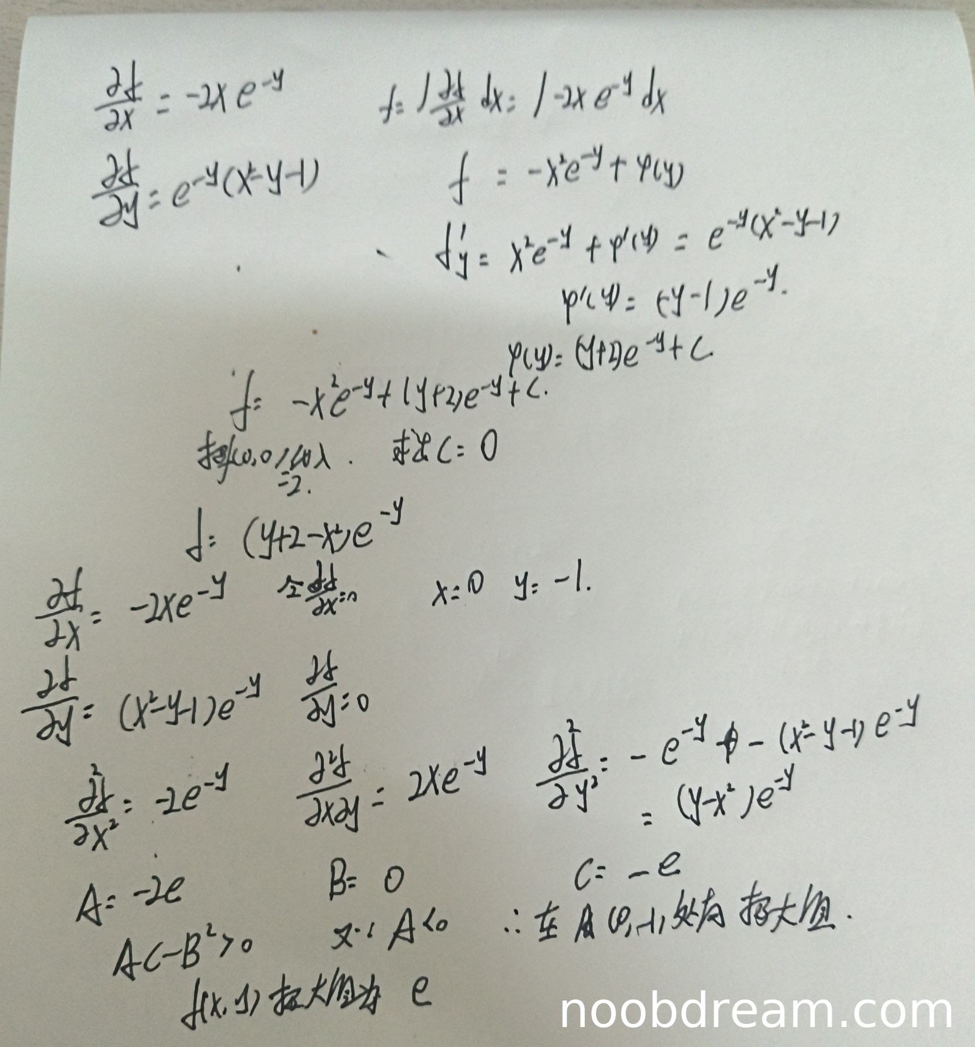 求极值部分:驻点求解正确,得到(0,-1);二阶偏导数计算正确;判别式AC-B²计算正确;极值判定正确;极大值计算正确。虽然在第一次识别中二阶偏导数∂²f/∂y²写为(y-x²)e^{-y}(应为(x²-y)e^{-y}),但在驻点处计算得到C=-e,结果正确,这可能是识别错误。第二次识别中整个过程完全正确。