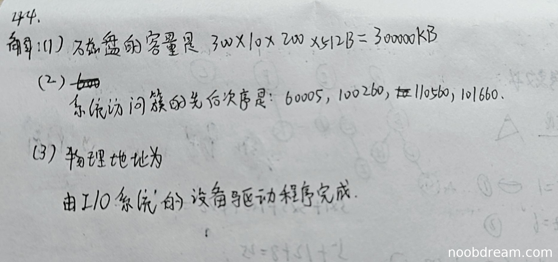 标准答案:柱面号100,磁道号5,扇区号60;磁盘驱动程序完成