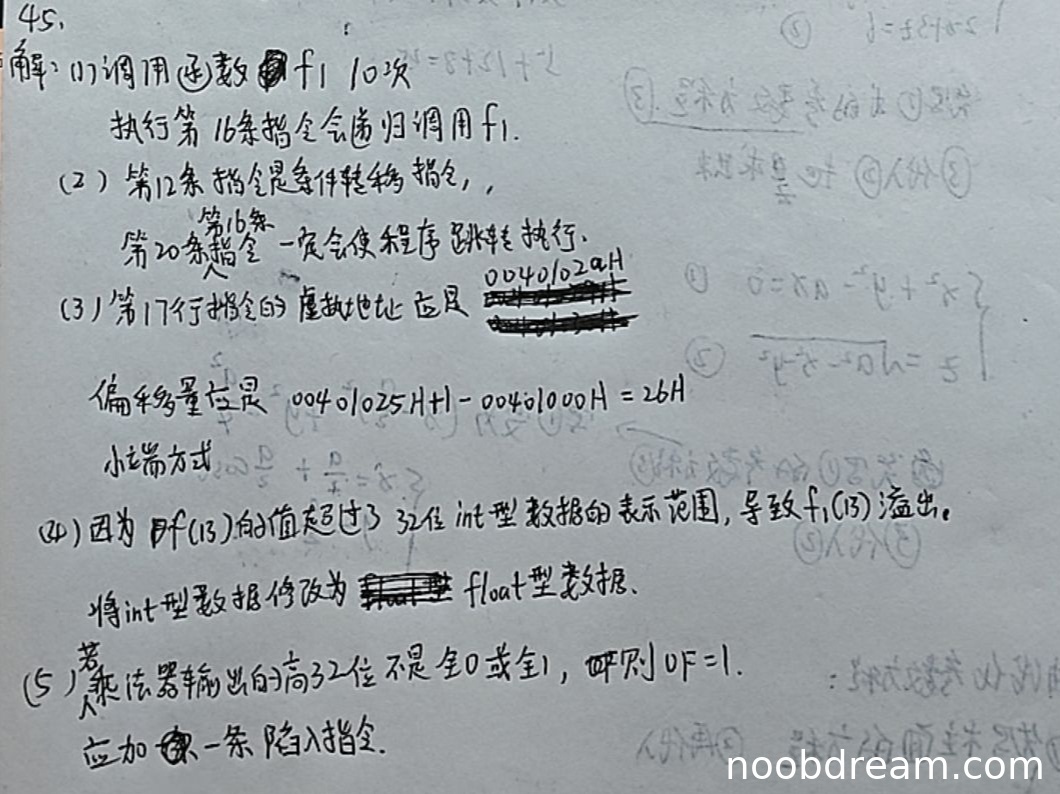 第二问:学生回答“执行第16条指令会递归调用f1”,正确,得1分。