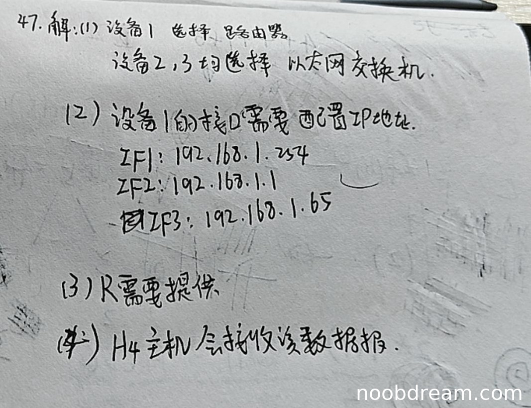 学生答案:设备1选择路由器,设备2、3均选择以太网交换机,与标准答案完全一致。得3分。