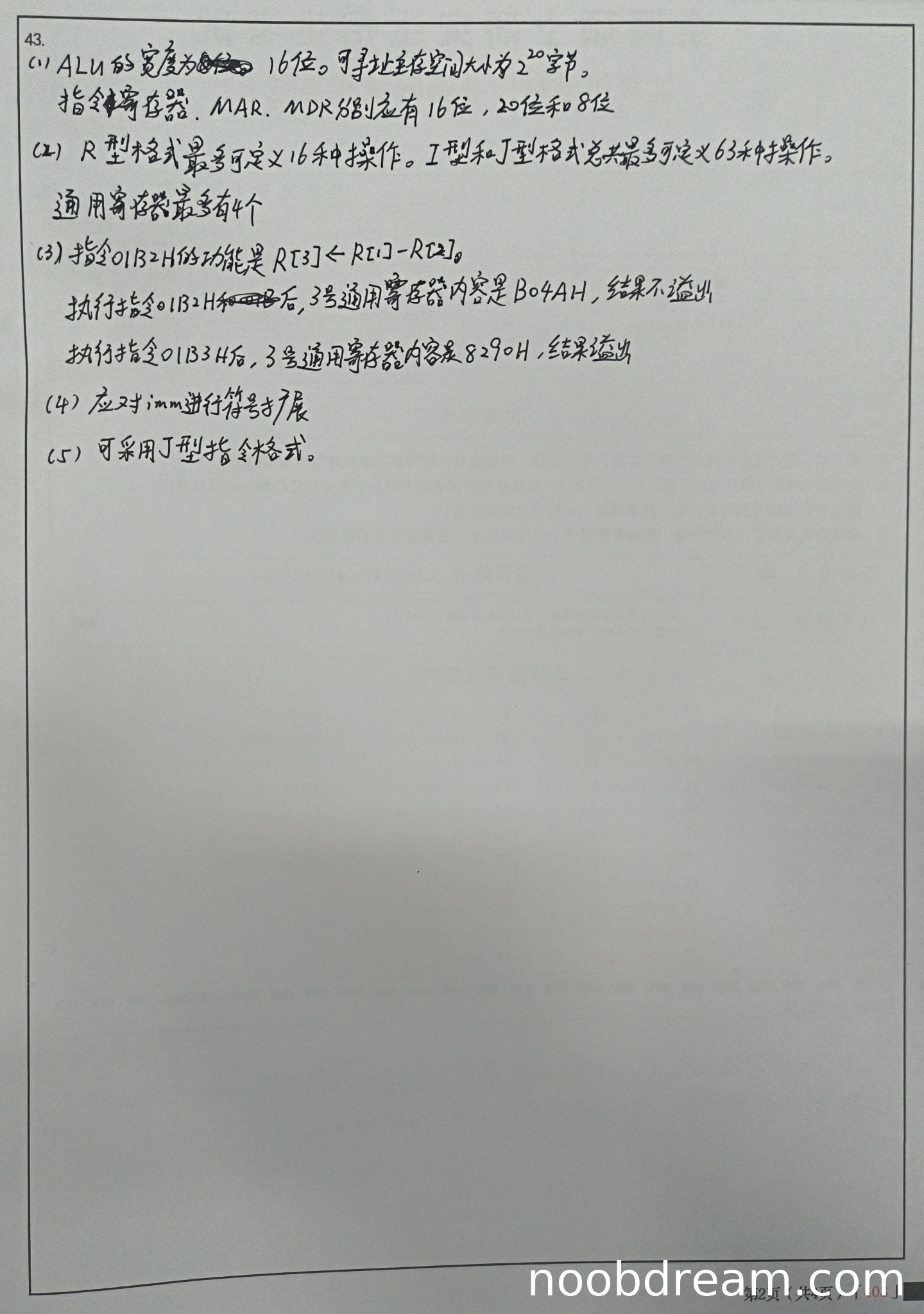 学生答案正确。R型最多16种操作、I型和J型总共63种操作、通用寄存器最多4个,与标准答案一致。得3分。