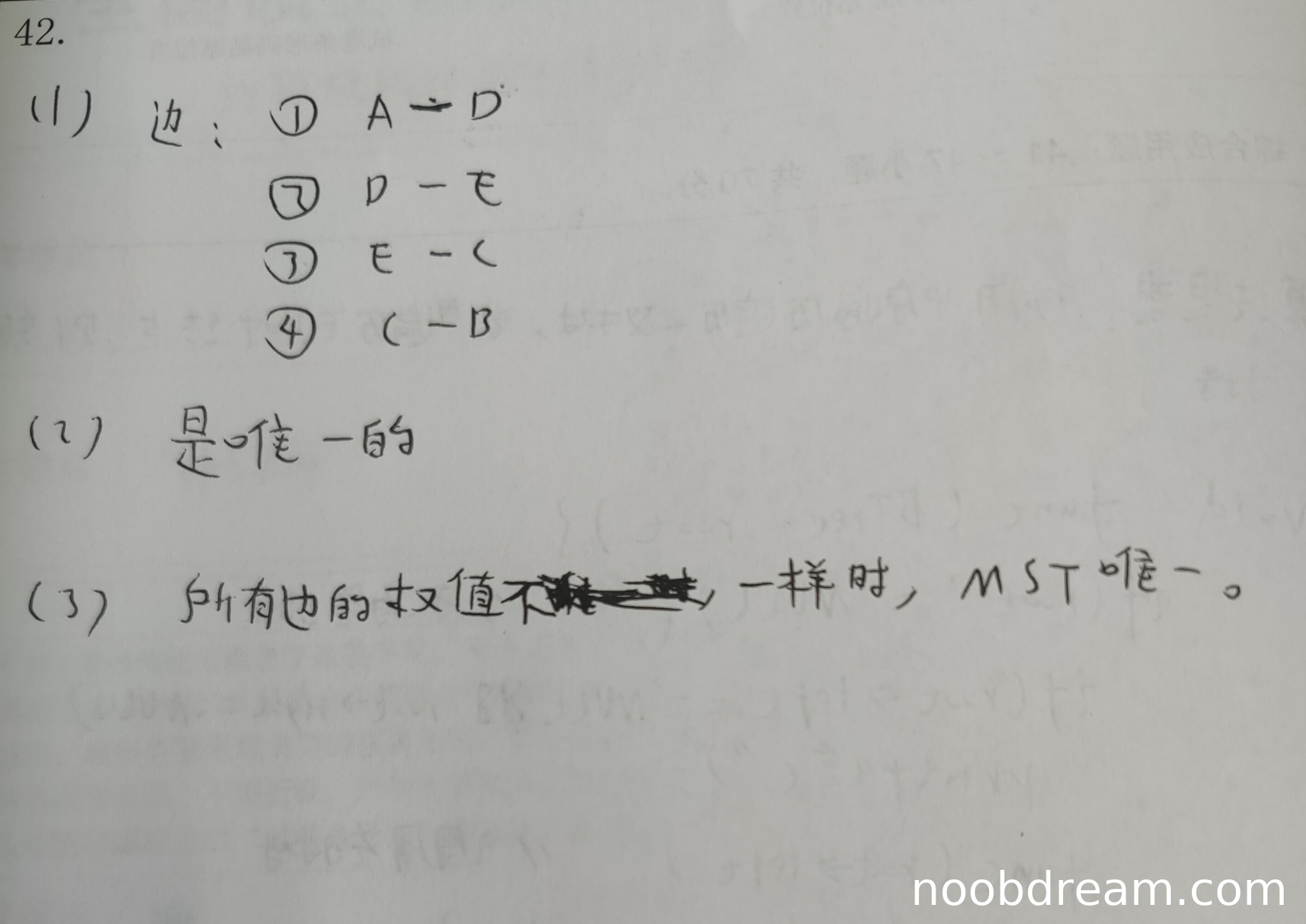 第一次识别结果为"所有边的权值一样时,MST唯一",这是错误的;第二次识别结果为"所有边的权值不一样时,MST唯一",虽然不完全精确但基本正确。标准答案是"当带权连通图的任意一个环中所包含的边的权值均不相同时,其MST是唯一的"。学生的回答虽然不够严谨,但抓住了"权值不同"这个关键点,考虑到可能存在识别误差,给予1分。