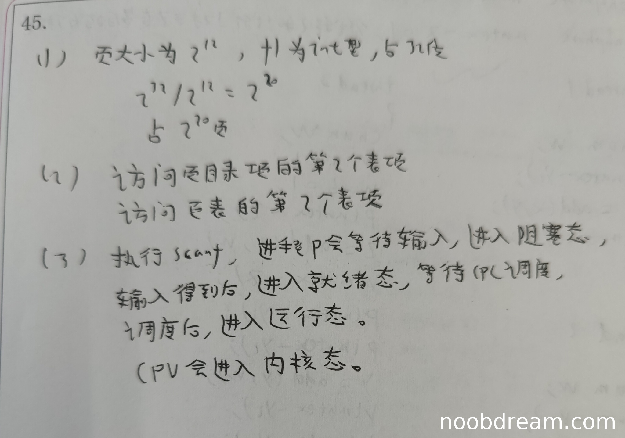 学生回答:执行scanf,进程P会等待输入,进入阻塞态;输入得到后,进入就绪态,等待CPU调度;调度后,进入运行态;PU会进入内核态。标准答案:进程P因等待输入从执行态变为阻塞态;输入结束时被中断处理程序唤醒变为就绪态;被调度程序调度变为运行态;CPU状态会从用户态变为内核态。