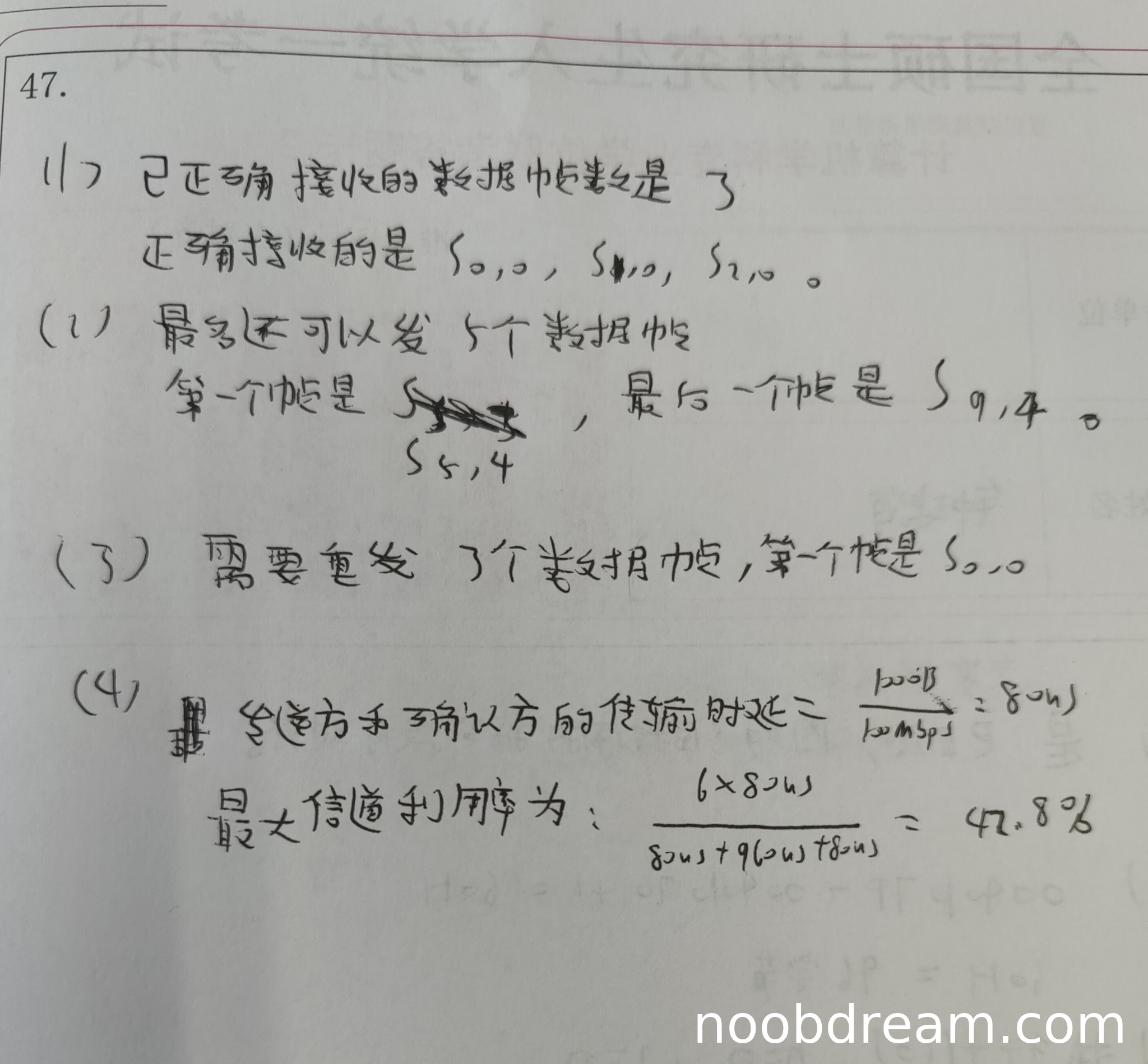 学生两次识别结果都正确回答了"最多还可以发5个数据帧",但在帧序号识别上存在错误:第一次识别中第一个帧缺失,第二次识别为S₅,₄;最后一次识别为S₉,₄。而标准答案是第一个帧为S₅,₂,最后一个帧为S₁,₂。考虑到序号识别可能存在误写(如2误写为4,1误写为9),且核心的"5个数据帧"数量正确,但帧序号识别错误需要扣分。扣1分,得2分。