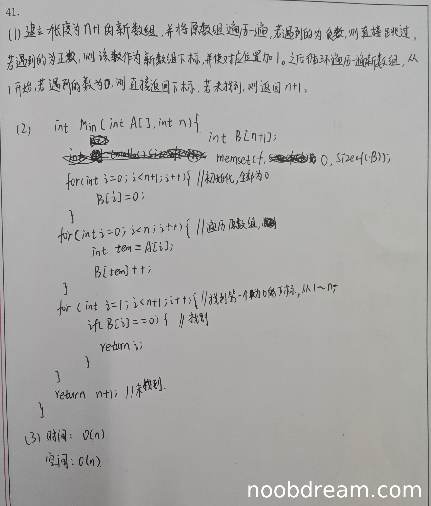 学生答案的基本设计思想是:创建一个长度为n+1的辅助数组,遍历原数组,将正数作为下标在辅助数组中标记,然后从1开始遍历辅助数组找到第一个未被标记的位置。这种思路是合理的,能够正确解决问题,与标准答案的哈希标记思想本质相同(只是实现方式不同)。因此得3分。