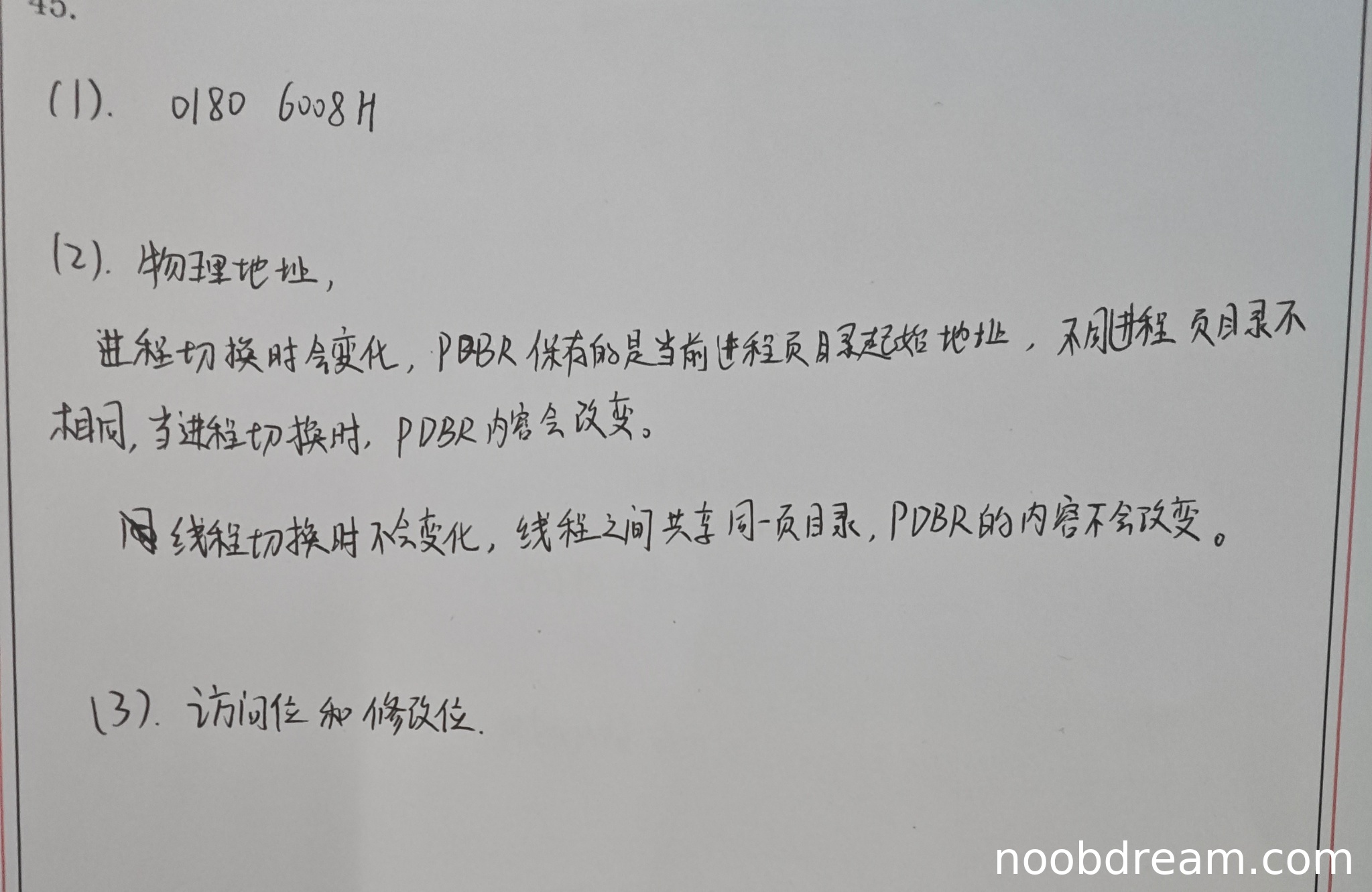 学生正确指出PDBR保存的是物理地址;正确指出进程切换时PDBR内容会变化,并给出合理理由(不同进程页目录不同);正确指出同一进程的线程切换时PDBR内容不会变化,并给出合理理由(线程共享同一页目录)。答案完整且正确。得4分。