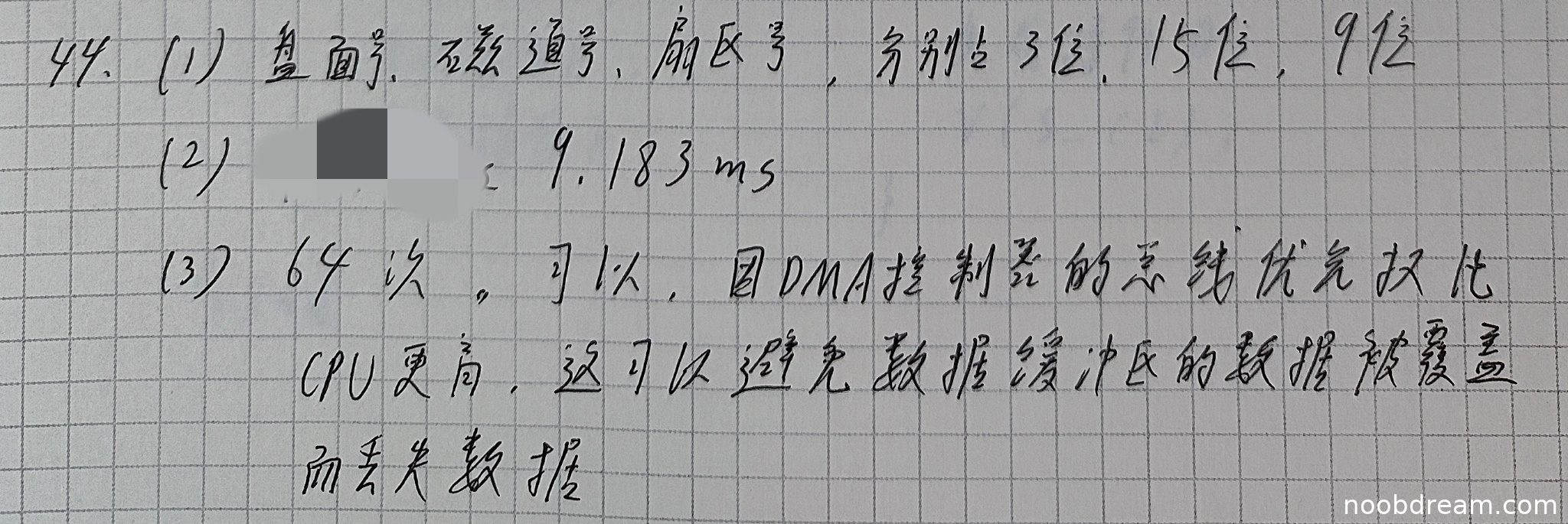 第一问:学生答案中DMA请求次数为64次,与标准答案一致,计算正确。第二问:学生答案中说明DMA控制器可以获得总线使用权,理由为“总线优先权比CPU更高”,与标准答案中“DMA请求的优先级更高”一致。第三问:学生答案中补充说明“避免数据缓冲区的数据被覆盖而丢失数据”,与标准答案中防止数据丢失的逻辑一致。因此得3分。