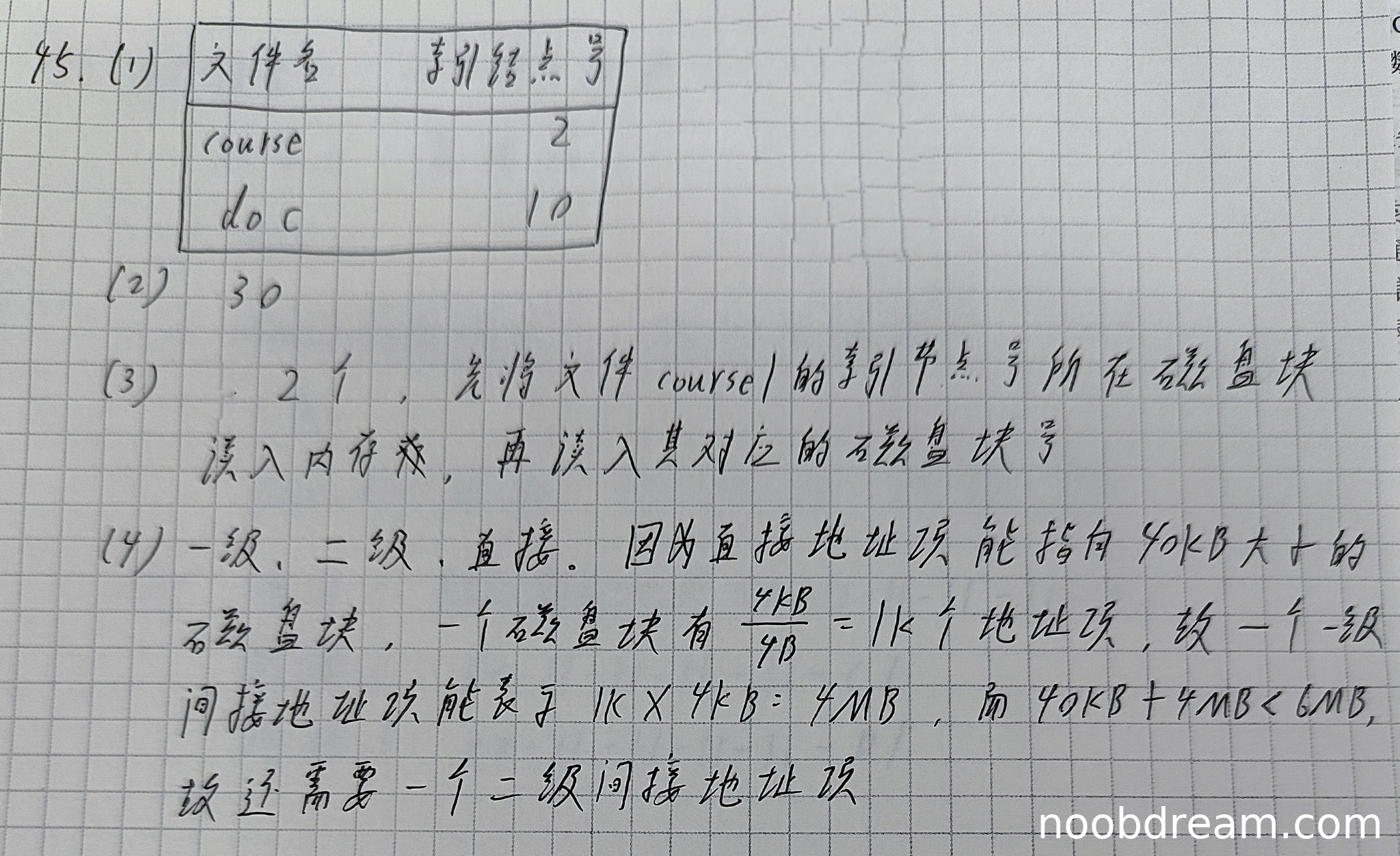 学生答案错误地包含了“直接”地址项,且计算过程有误。标准答案仅需使用一级和二级间接地址项,学生错误地认为直接地址项也需要使用。计算中直接地址项可指向10×4KB=40KB,一级间接地址项可指向1024×4KB=4MB,二级间接地址项可指向1024×1024×4KB=4GB。文件大小6MB需1536个磁盘块,直接地址项(10块)和一级间接地址项(1024块)共1034块,不足1536块,因此需使用二级间接地址项,但直接地址项已包含在1034块中,无需特别指出“直接”。学生表述“直接、一级、二级”不符合标准答案,且理由计算有混淆(40KB+4MB<6MB错误,应为40KB+4MB=4.04MB<6MB,但实际1034块对应约4.04MB容量,确实不足6MB)。核心错误在于多余列出“直接”,且未正确理解地址项使用顺序。扣1分。得1分。