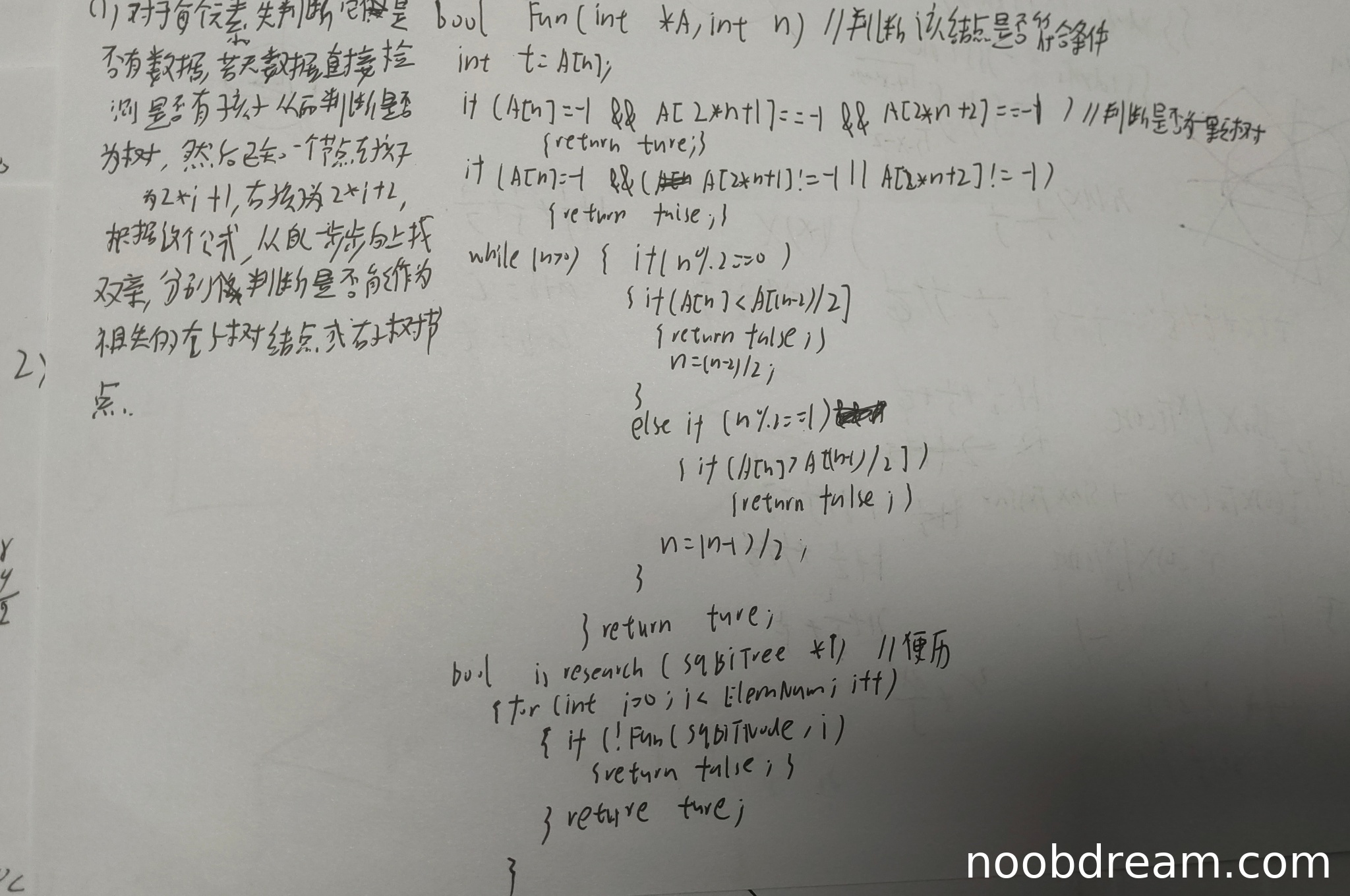 - 第二个if条件判断错误:当A[n]≠-1且左右孩子至少有一个不为-1时返回false,这完全错误,因为非叶子节点有孩子是正常情况