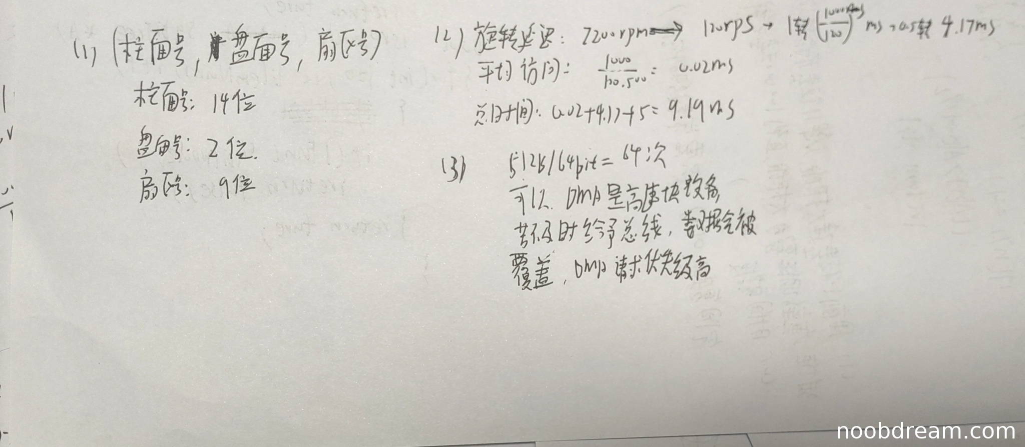 平均延迟时间计算:7200rpm→120rps→旋转半圈时间4.17ms正确(得1分)。