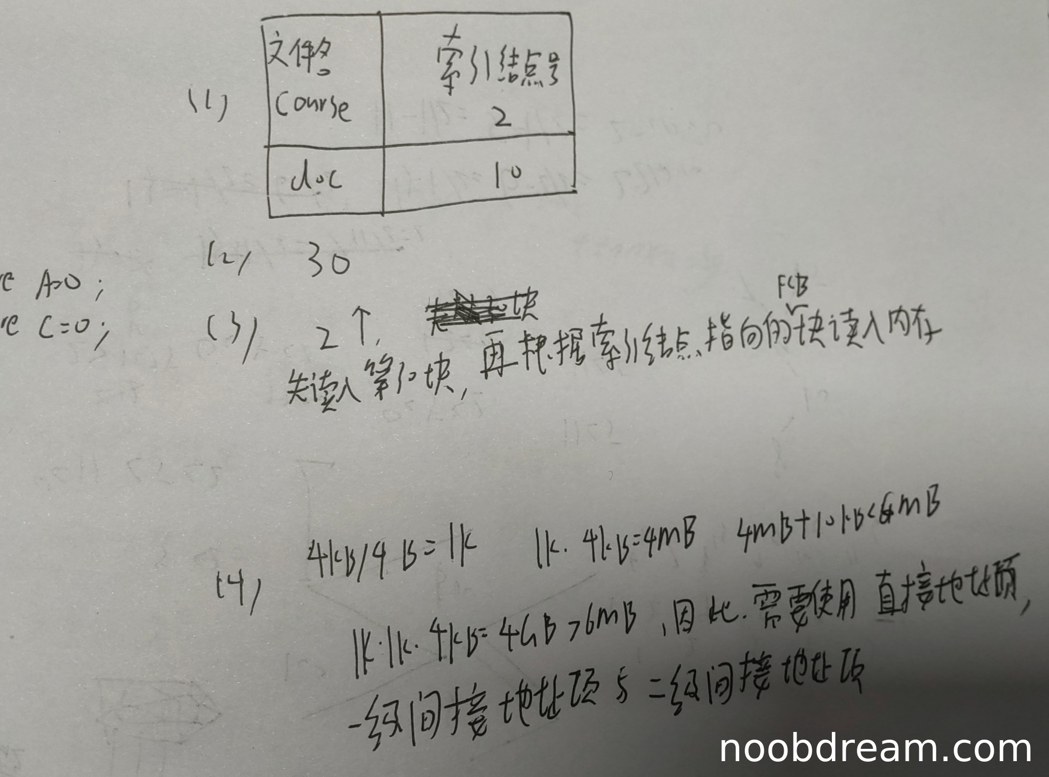 学生计算过程基本正确:4KB/4B=1024,1024×4KB=4MB,1024×1024×4KB=4GB。但结论中说"需要使用直接地址项,一级间接地址项与二级间接地址项"存在逻辑错误。根据计算,4MB+10KB<6MB,说明直接地址项和一级间接地址项不足以存储6MB文件,需要用到二级间接地址项,但直接地址项是必然使用的,标准答案强调的是需要用到一级和二级间接地址项。学生虽然列出了所有地址项,但表述不够准确,存在轻微逻辑问题。扣1分,得1分。