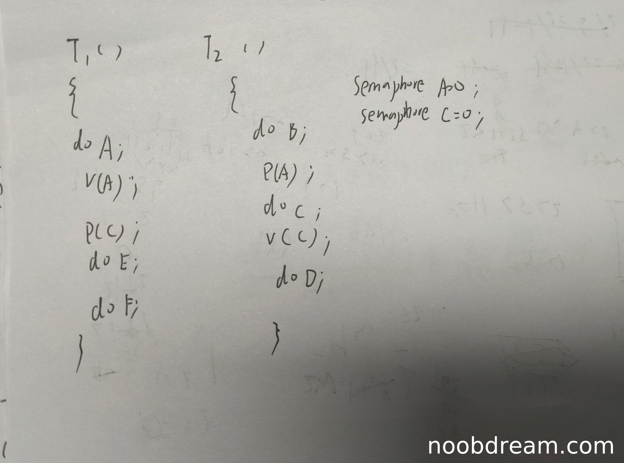 理由:T2中先执行B,然后P(A)(对应wait(S_AC))后执行C,再V(C)(对应signal(S_CE))后执行D,完全符合同步要求。操作顺序正确,信号量使用恰当。
