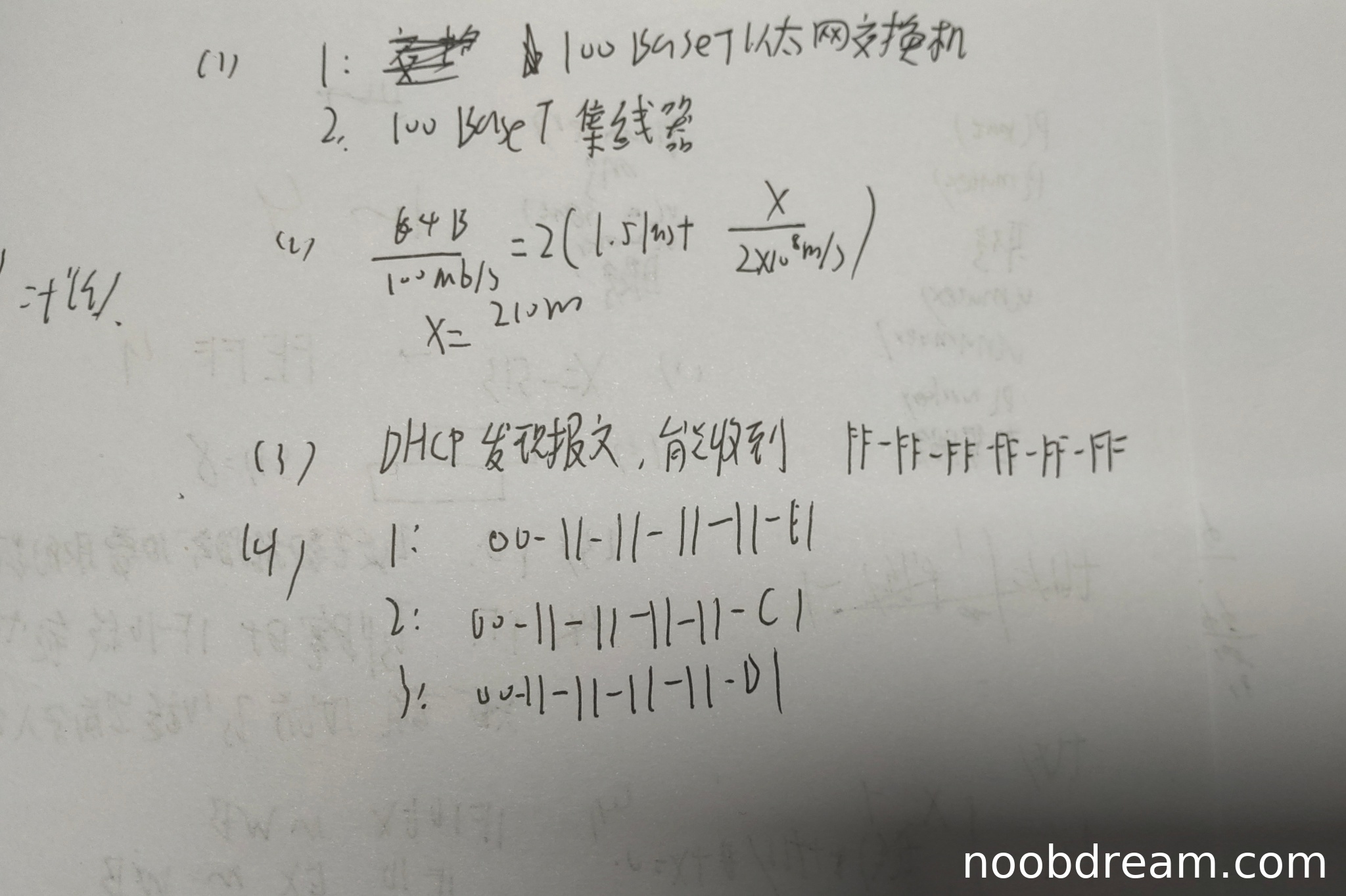 学生答案计算过程与标准答案一致,正确使用公式:最短帧长 = 总线传播时延 × 数据传输速率 × 2,代入64B帧长、100Mbps速率、1.51μs额外延迟和2×10^8m/s传播速度,最终得到210m。虽然公式书写格式略有不同(如使用X代替D),但计算逻辑和结果正确。得1分。