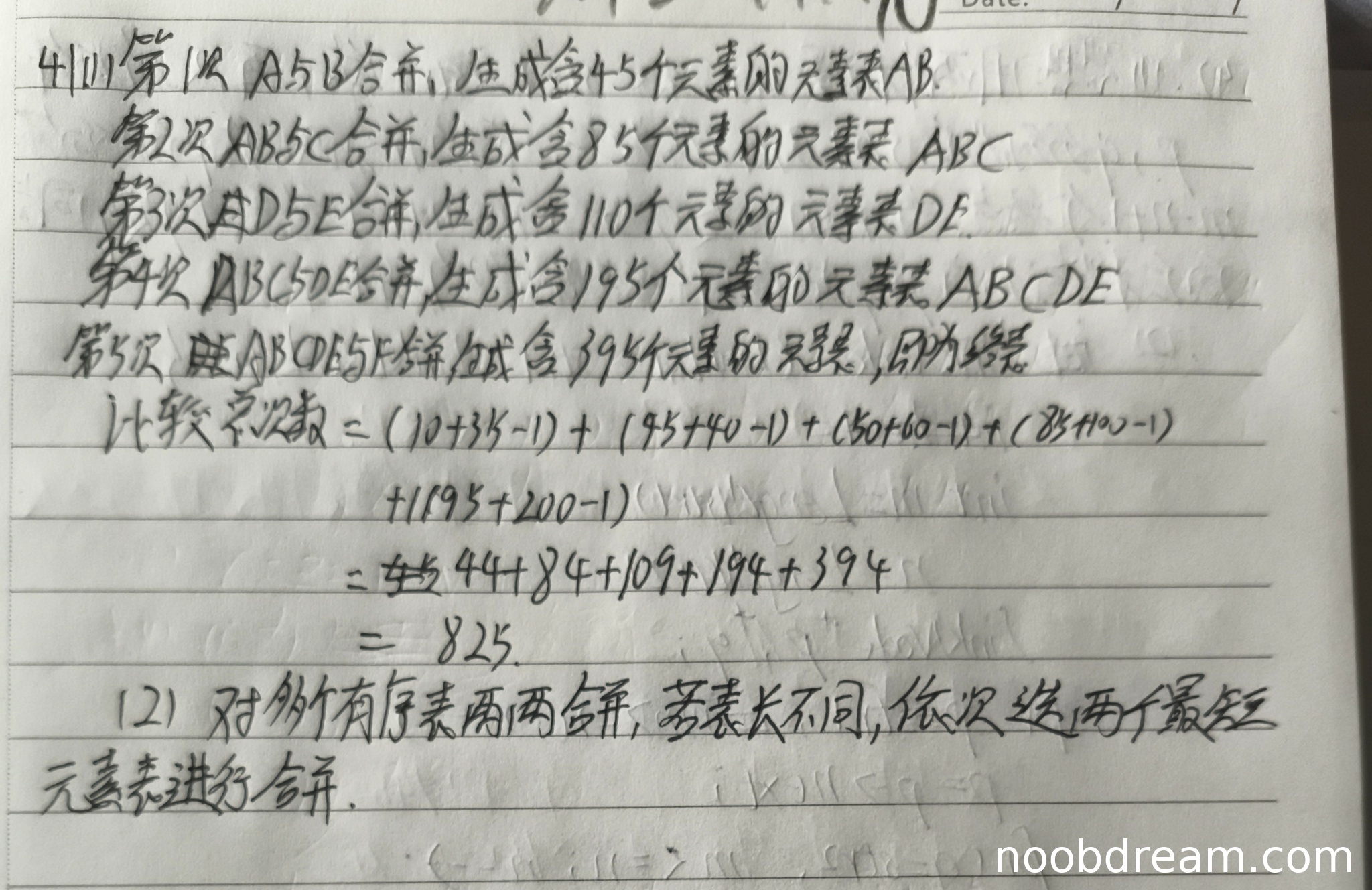 学生给出了完整的合并过程:第一次合并A与B(10+35=45),第二次合并AB与C(45+40=85),第三次合并D与E(50+60=110),第四次合并ABC与DE(85+110=195),第五次合并ABCDE与F(195+200=395)。该过程符合哈夫曼树(最佳归并树)思想,合并顺序正确。计算最坏情况下比较次数时,公式正确(m+n-1),计算过程无误,结果825正确。但第一次识别结果中“AD与E合并”应为“D与E合并”,第二次识别已纠正,且上下文判断为识别错误,不扣分。因此,本题得7分。