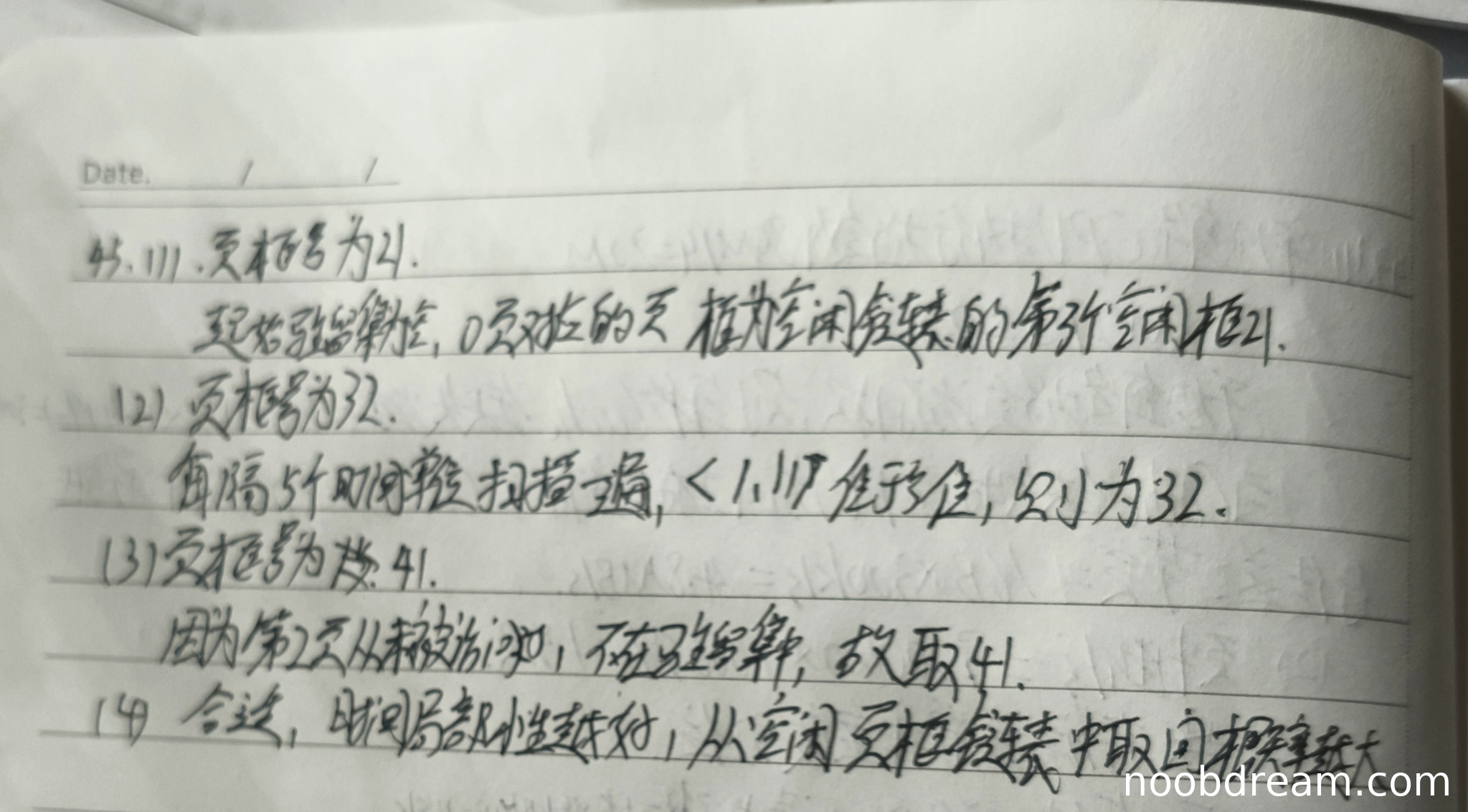 学生两次识别结果均回答页框号为32,与标准答案一致。解释中提到"每隔5个时间段扫描一遍"正确,但"<1.117毫秒复位"、"<1,1>页迁移"等表述不清晰。不过学生正确识别了关键页框号,且理由核心正确。得2分。