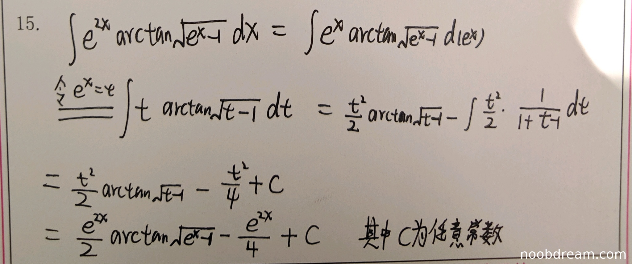 学生作答使用了换元法(令 \( e^x = t \))和分部积分法,思路正确。但在分部积分过程中,对 \( u = \arctan\sqrt{t-1} \) 求导时出现逻辑错误:导数计算应为 \( \frac{du}{dt} = \frac{1}{1 + (\sqrt{t-1})^2} \cdot \frac{1}{2\sqrt{t-1}} = \frac{1}{2t\sqrt{t-1}} \),但学生在代入分部积分公式时错误地简化为 \( \frac{1}{t} \),导致后续积分计算错误。最终结果与标准答案不一致,且缺少关键项 \( -\frac{1}{6}(e^x + 2)\sqrt{e^x - 1} \)。根据逻辑错误扣分原则,扣除4分(主要错误在导数计算和积分简化)。