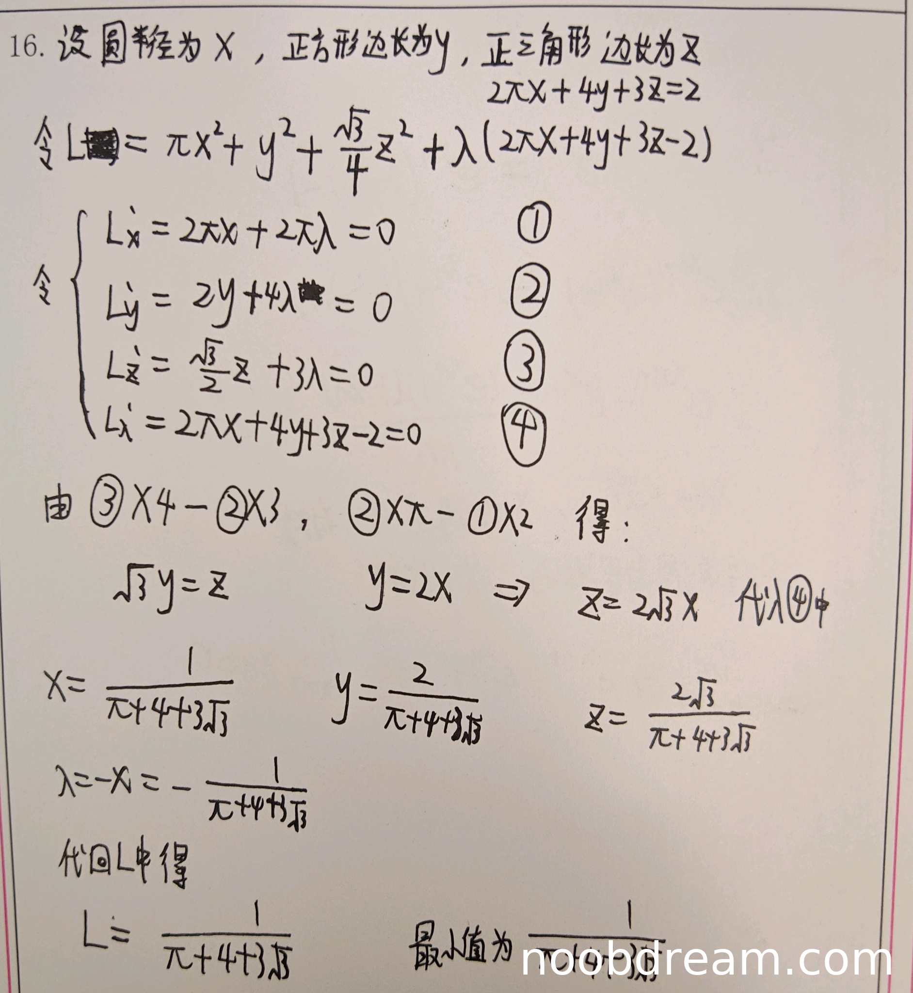 - 目标函数定义错误:学生将面积函数写为 \( \pi x^2 + y^2 + \frac{\sqrt{3}}{4}z^2 \),但根据几何关系,圆面积应为 \( \pi x^2 \)(正确),正方形面积应为 \( y^2 \)(正确),但正三角形面积应为 \( \frac{\sqrt{3}}{4}z^2 \)(正确)。然而在拉格朗日函数中,学生错误地将约束条件 \( 2\pi x + 4y + 3z = 2 \) 直接作为拉格朗日乘数项,这实际上混淆了目标函数与拉格朗日函数的构造。标准答案中目标函数是三个图形的面积之和,而学生将拉格朗日函数直接标记为 \( L \) 并代入求解,这在数学表达上不严谨,但最终计算过程正确。