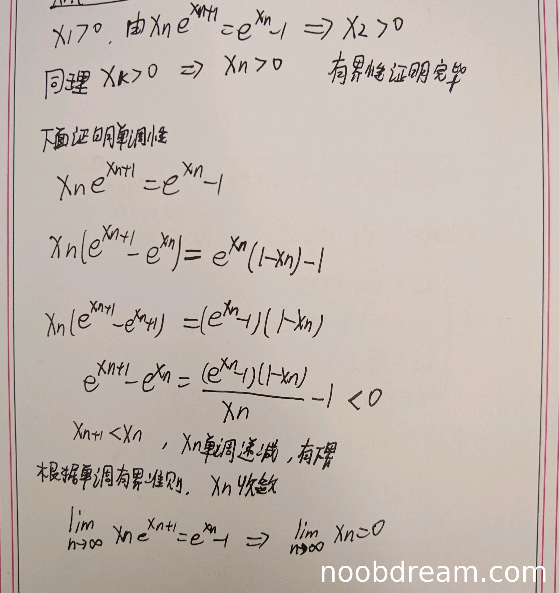 学生在单调性证明过程中存在逻辑错误。推导过程中出现了 $x_n(e^{x_{n+1}}-e^{x_{n+1}})$ 这样的表达式(显然等于0),且后续推导 $\frac{(e^{x_n}-1)(1-x_n)}{x_n}-1<0$ 缺乏严格论证。标准答案使用微分中值定理的证明更为严谨。因此扣2分,得2分。