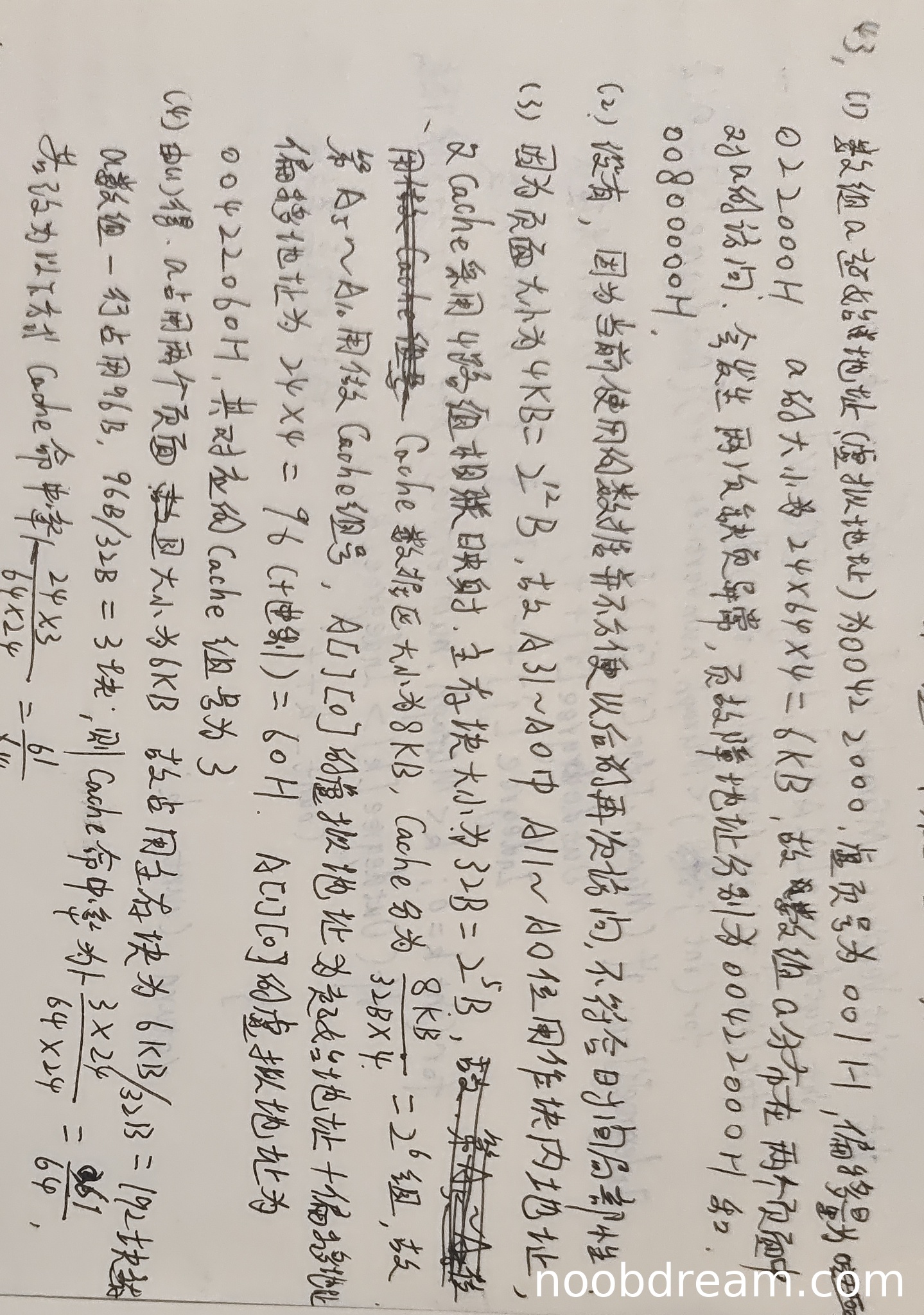第一次识别:块内地址分析错误(说A11~A0,应为A4~A0),Cache组号分析错误(说A5~A0,应为A10~A5),a[1][0]虚拟地址0042 2100H正确(得1分),Cache组号3错误(应为8)。第二次识别基本无法识别有效内容。本小题仅得1分