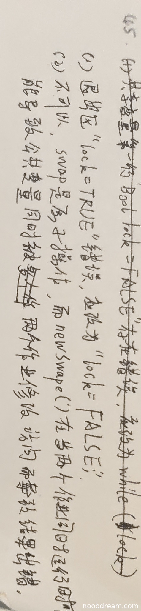 对于第一个错误,学生的修改建议 "while (!lock)" 与标准答案 "while (key == TRUE)" 不一致,但逻辑上等价(因为 key 初始为 TRUE,且通过 swap 与 lock 交换值),思路正确,不扣分。