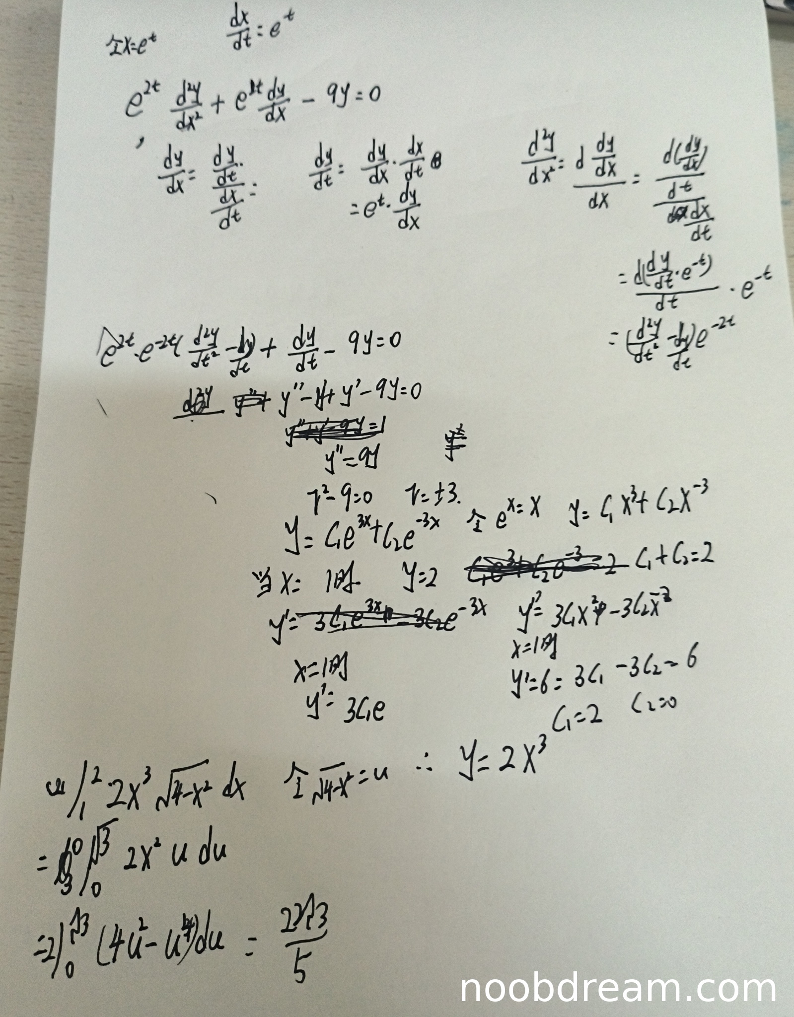 学生通过变量代换 \(x = e^t\) 正确推导出 \(\frac{dy}{dx} = \frac{dy}{dt} e^{-t}\) 和 \(\frac{d^2y}{dx^2} = \left(\frac{d^2y}{dt^2} - \frac{dy}{dt}\right)e^{-2t}\),并代入原方程得到 \(y'' - 9y = 0\)。求解特征方程得到通解 \(y = C_1 e^{3t} + C_2 e^{-3t}\),回代 \(t = \ln x\) 得到 \(y = C_1 x^3 + C_2 x^{-3}\)。利用初始条件 \(y(1)=2, y'(1)=6\) 正确解得 \(C_1=2, C_2=0\),最终得到 \(y=2x^3\)。虽然第一次识别中在代入初始条件时出现 "x = ln y" 的笔误(应为 \(x=1\) 时 \(t=0\)),但根据后续计算可判断为识别错误,不影响核心逻辑。计算过程完整正确,得6分。