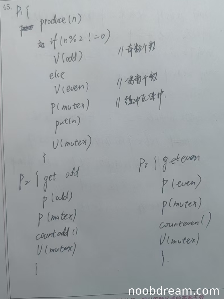 学生作答中P2进程缺少从缓冲区取出奇数的操作(getodd()),只有计数操作(countodd())。同时缺少取出数据后释放缓冲区空单元的操作(V(empty))。存在逻辑错误,此项得0分。