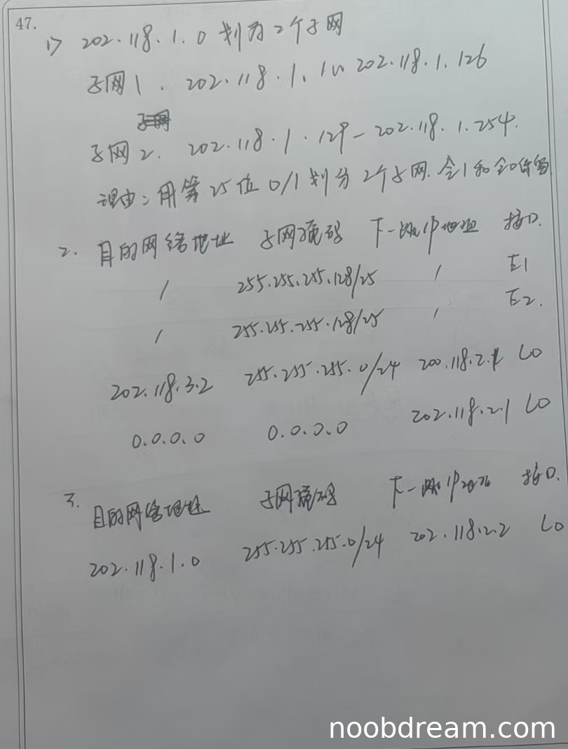 学生给出了子网划分结果:子网1为202.118.1.1-202.118.1.126,子网2为202.118.1.129-202.118.1.254,并说明用第25位0/1划分。这实际上对应了子网掩码255.255.255.128(/25),划分结果是正确的。虽然学生没有明确写出网络地址(如202.118.1.0/25和202.118.1.128/25),但给出的IP范围正确反映了划分。理由中提到"全1和全0保留",在CIDR中是可接受的。因此,思路正确,给满分3分。
