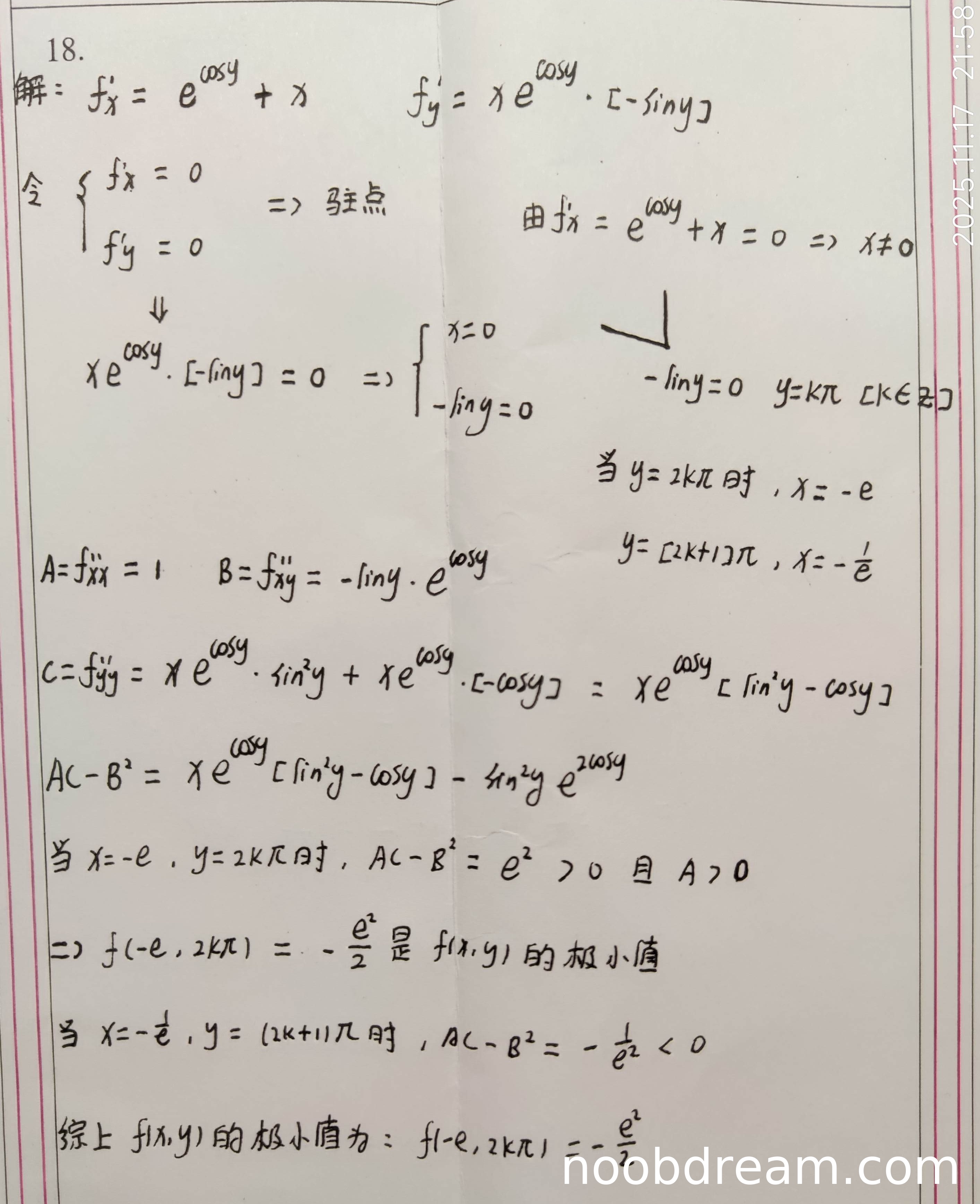 - 极值判别正确:使用 \( AC - B^2 \) 判别法,在驻点 \( (-e, 2k\pi) \) 处,\( AC - B^2 = e^2 > 0 \) 且 \( A > 0 \),判定为极小值点;在驻点 \( (-\frac{1}{e}, (2k+1)\pi) \) 处,\( AC - B^2 = -\frac{1}{e^2} < 0 \),判定为非极值点。