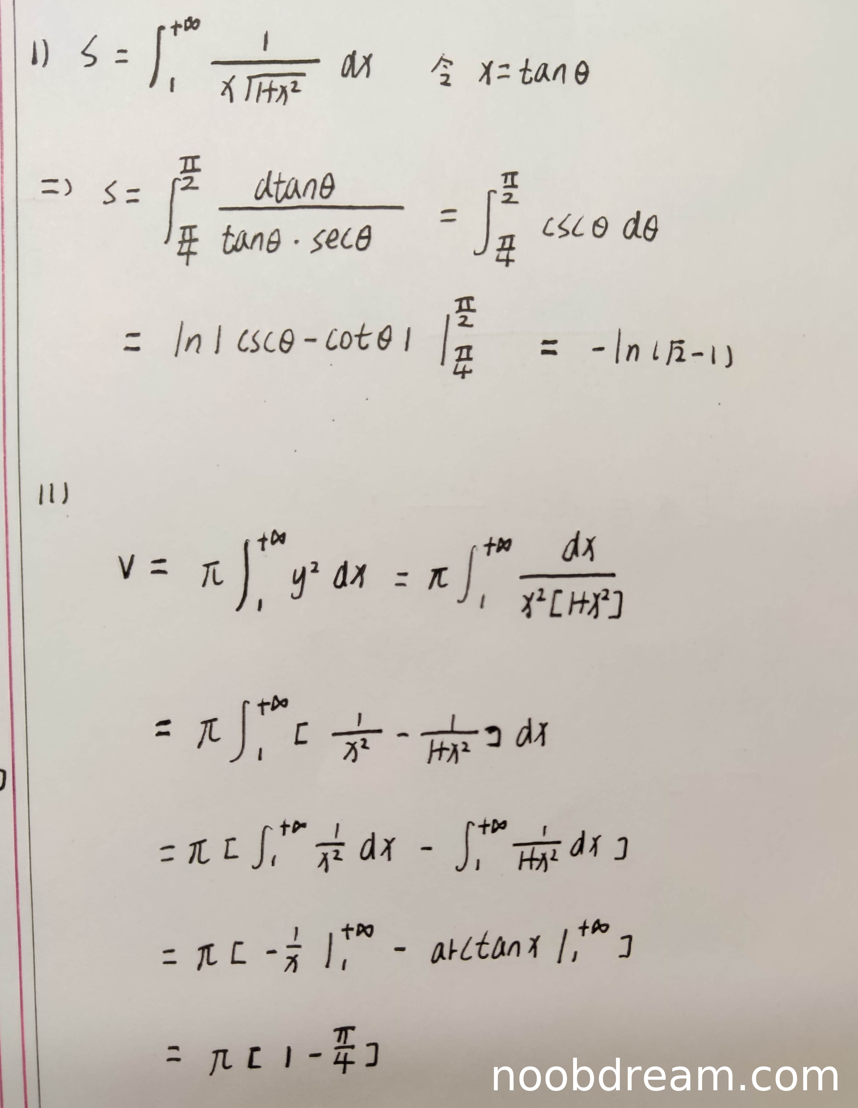 学生使用三角代换法计算面积:令 \( x = \tan\theta \),得到 \( S = \int_{\pi/4}^{\pi/2} \csc\theta \, d\theta = \left. \ln|\csc\theta - \cot\theta| \right|_{\pi/4}^{\pi/2} = -\ln(\sqrt{2}-1) \)。