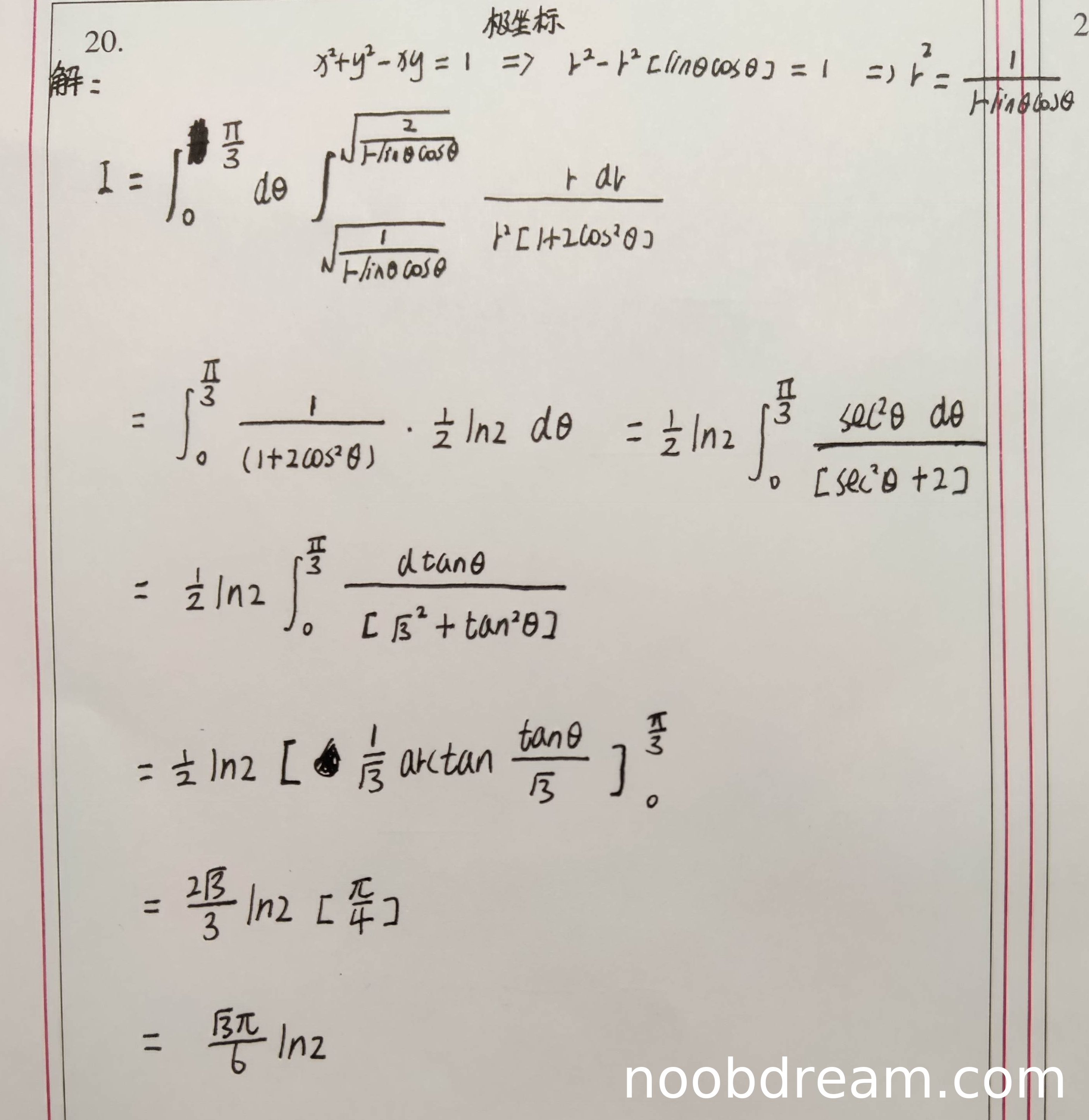 得到错误结果\(\frac{\sqrt{3}\pi}{6}\ln 2\),而正确答案应为\(\frac{\sqrt{3}\pi}{24}\ln 2\)。扣2分。得0分。