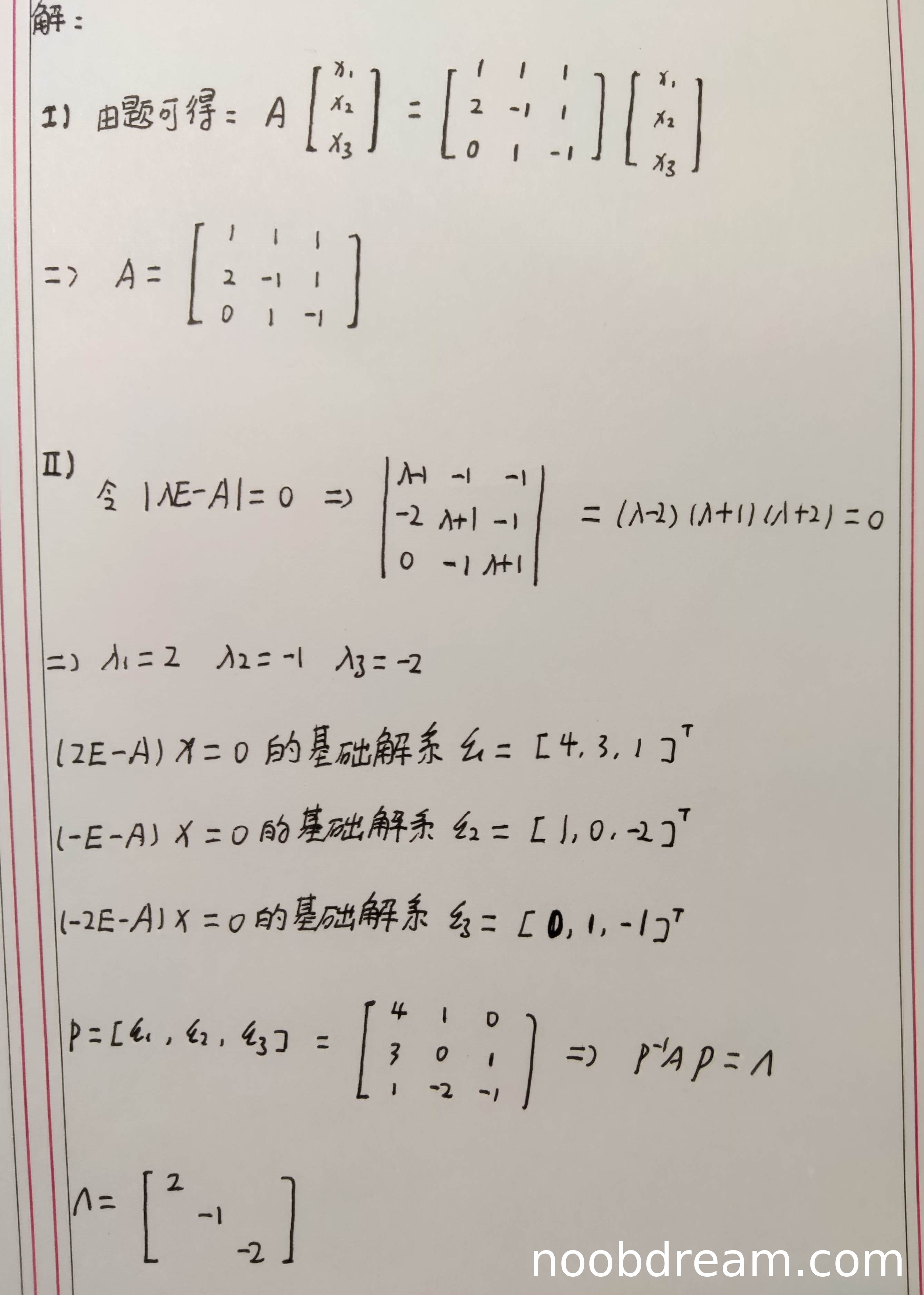 - 对λ₃=-2,解(-2E-A)x=0,得到ξ₃=[0,1,-1]ᵀ(正确)