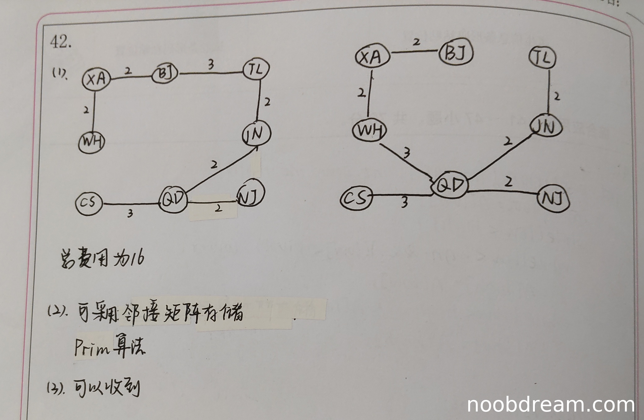 学生答案中给出了总费用为16,这与标准答案中最小生成树的总费用一致。但学生未给出具体的最小生成树方案(即边列表或图示),而题目要求"给出所有可能的最经济的光缆铺设方案(用带权图表示)"。因此,学生只完成了费用计算部分,未完整给出方案描述。根据评分标准,应扣除部分分数。
