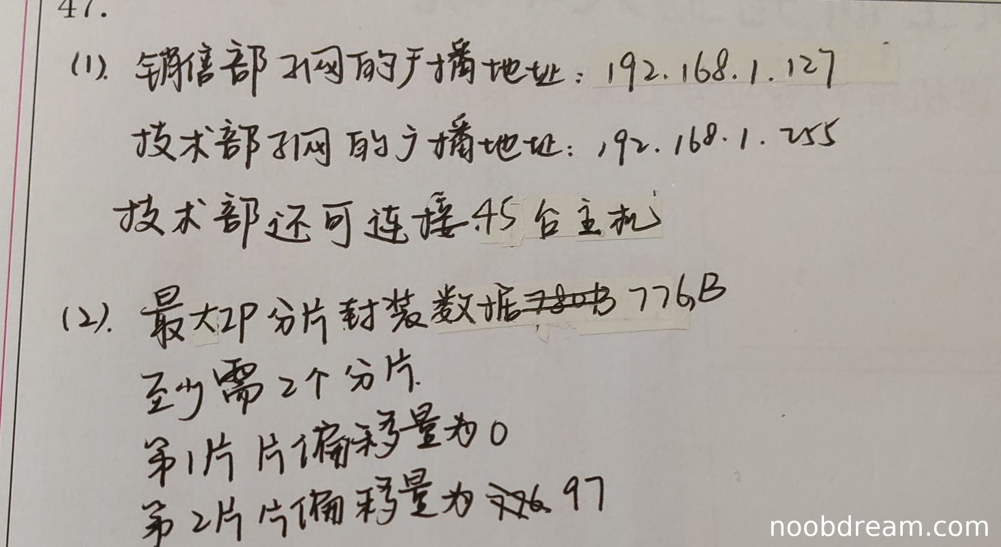 第一问:销售部子网的广播地址为192.168.1.127,与标准答案一致,得1分。