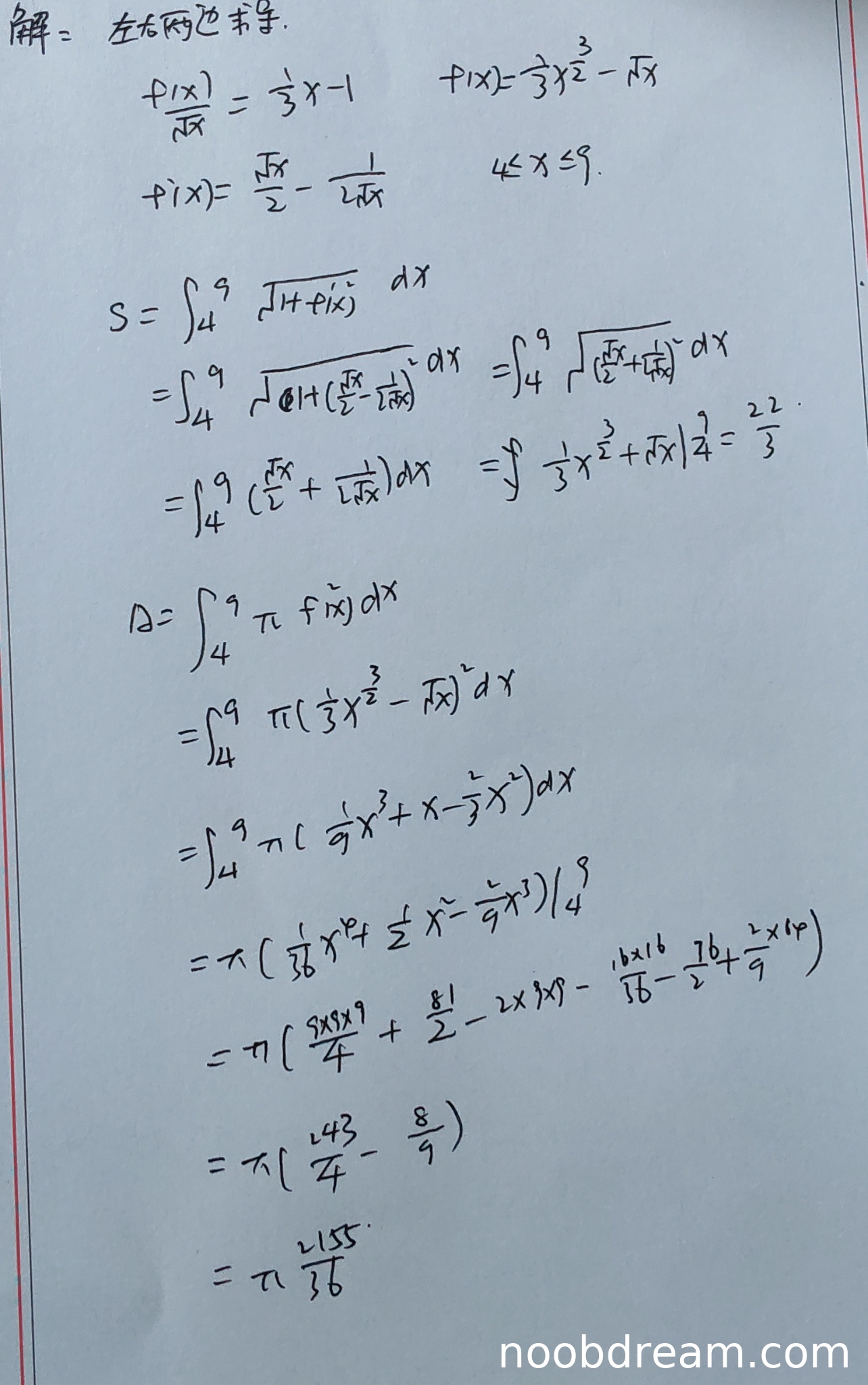 学生错误地使用了旋转体体积公式A=∫π[f(x)]²dx来计算旋转曲面面积,而正确的旋转曲面面积公式应为A=2π∫f(x)√(1+[f'(x)]²)dx。这是一个严重的逻辑错误,表明学生对旋转曲面面积的概念理解有误。虽然计算过程本身正确,但由于使用了错误的公式,只能得0分。