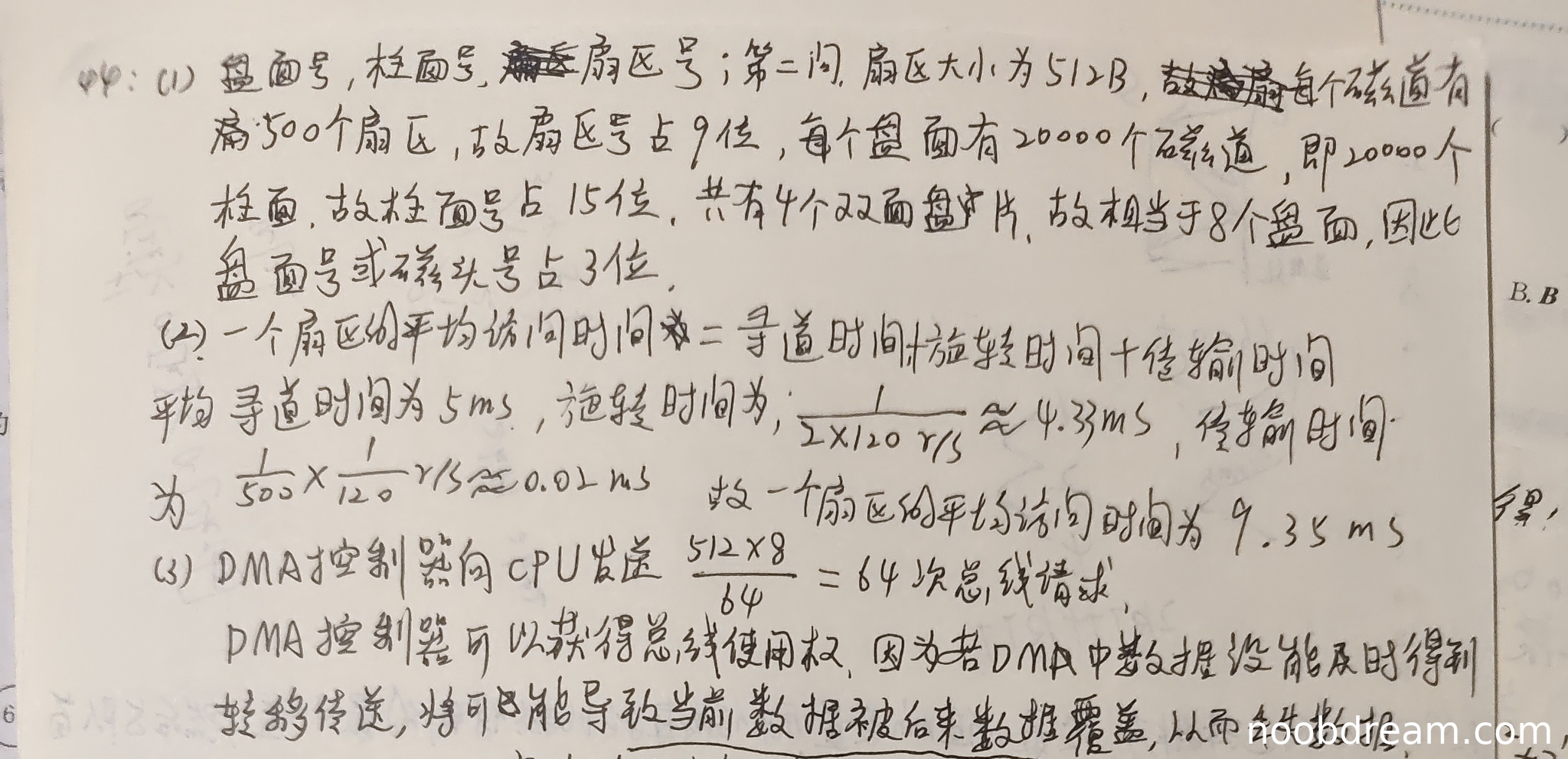学生正确给出了平均访问时间的三个组成部分(寻道时间、旋转时间、传输时间),并正确计算了平均寻道时间(5ms)和传输时间(0.017ms)。但在计算旋转时间时,学生使用了公式1/(2×120) s,其中120是由7200rpm换算得到的转速(7200/60=120r/s),但计算结果是4.33ms,而标准答案为4.167ms。这里存在计算误差,但思路正确,且最终结果9.35ms与标准答案9.183ms接近。考虑到计算过程中的微小误差,扣0.5分。因此得1.5分。