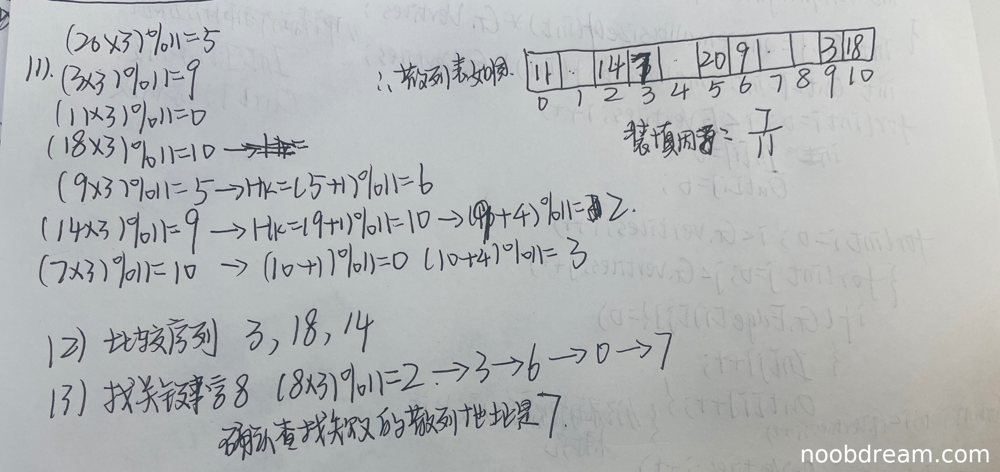 学生正确计算了8的初始散列地址为2,并给出了正确的探查序列2→3→6→0→7,最终确认查找失败的散列地址为7,与标准答案完全一致。给予2分。