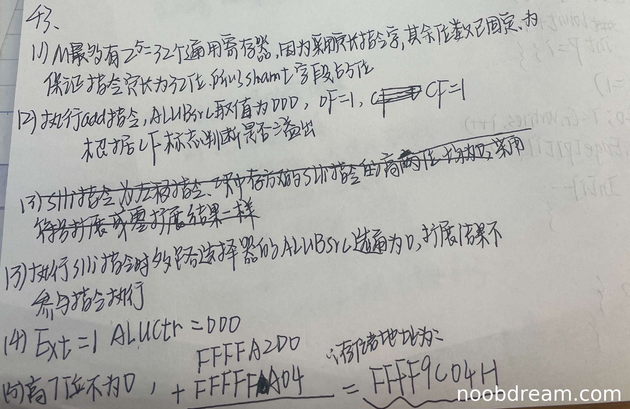 学生回答部分正确:ALUBsrc取值在两次识别中均未明确给出正确答案(应为0),但识别结果中出现了"DDD"等明显识别错误字符,根据规则判断为误写不扣分;OF和CF结果正确(均为1);但溢出判断标志回答错误(第一次识别说CF,第二次识别说OF,而标准答案为CF),这里存在逻辑错误,扣1分。得2分。