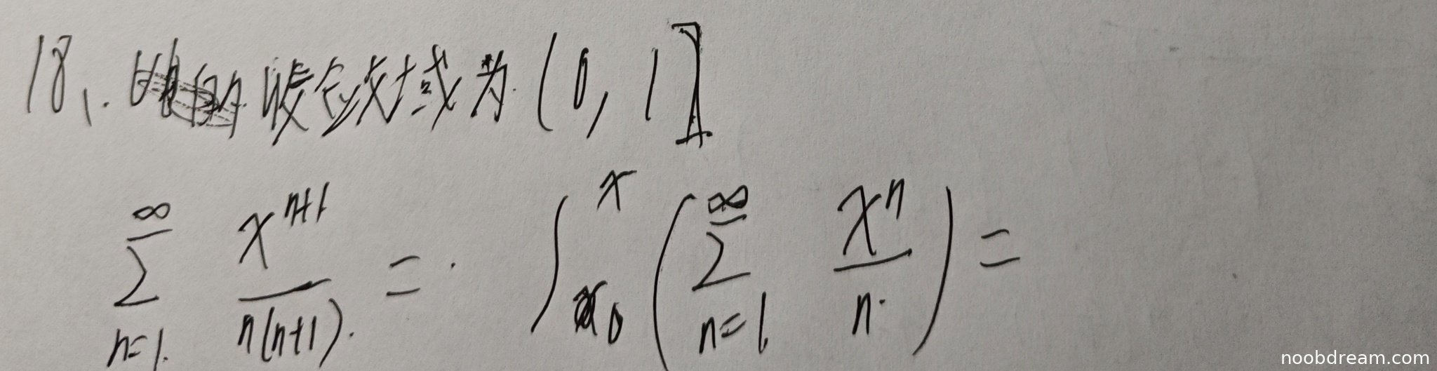 学生答案中只写出了和函数计算的部分表达式:\(\sum_{n = 1}^{\infty}\frac{x^{n + 1}}{n(n + 1)}=\int_{0}^{x}(\sum_{n = 1}^{\infty}\frac{x^{n}}{n})\),这个表达式存在以下问题:
