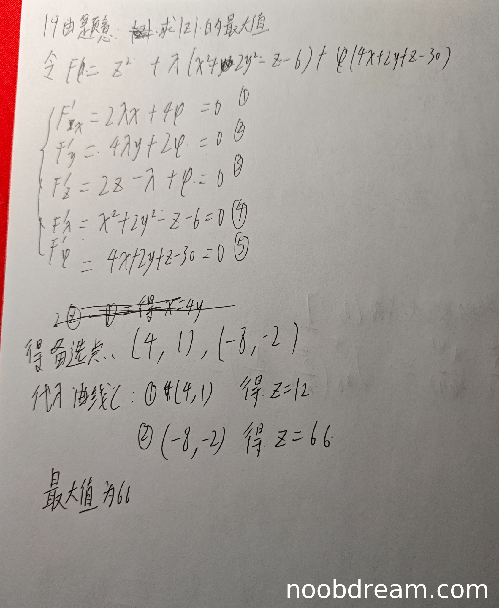 学生使用拉格朗日乘数法求解距离最大值问题,思路正确。在第一次识别中,拉格朗日函数变量定义不完整(缺少x,y,z),但第二次识别中已修正为完整形式。方程组建立正确,通过消元得到x=4y的关系,并正确求出两个候选点(4,1,12)和(-8,-2,66),最终得出最大距离66。
