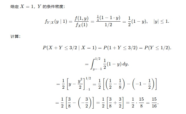 - 正确计算了P{X+Y≤3/2|X=1}=P{Y≤1/2|X=1}=15/16